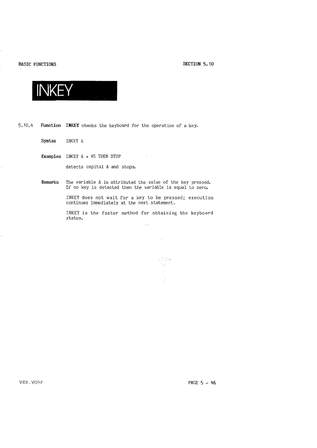 5, 10,4 Function INKEY checks the keyboard for the operation of a key.