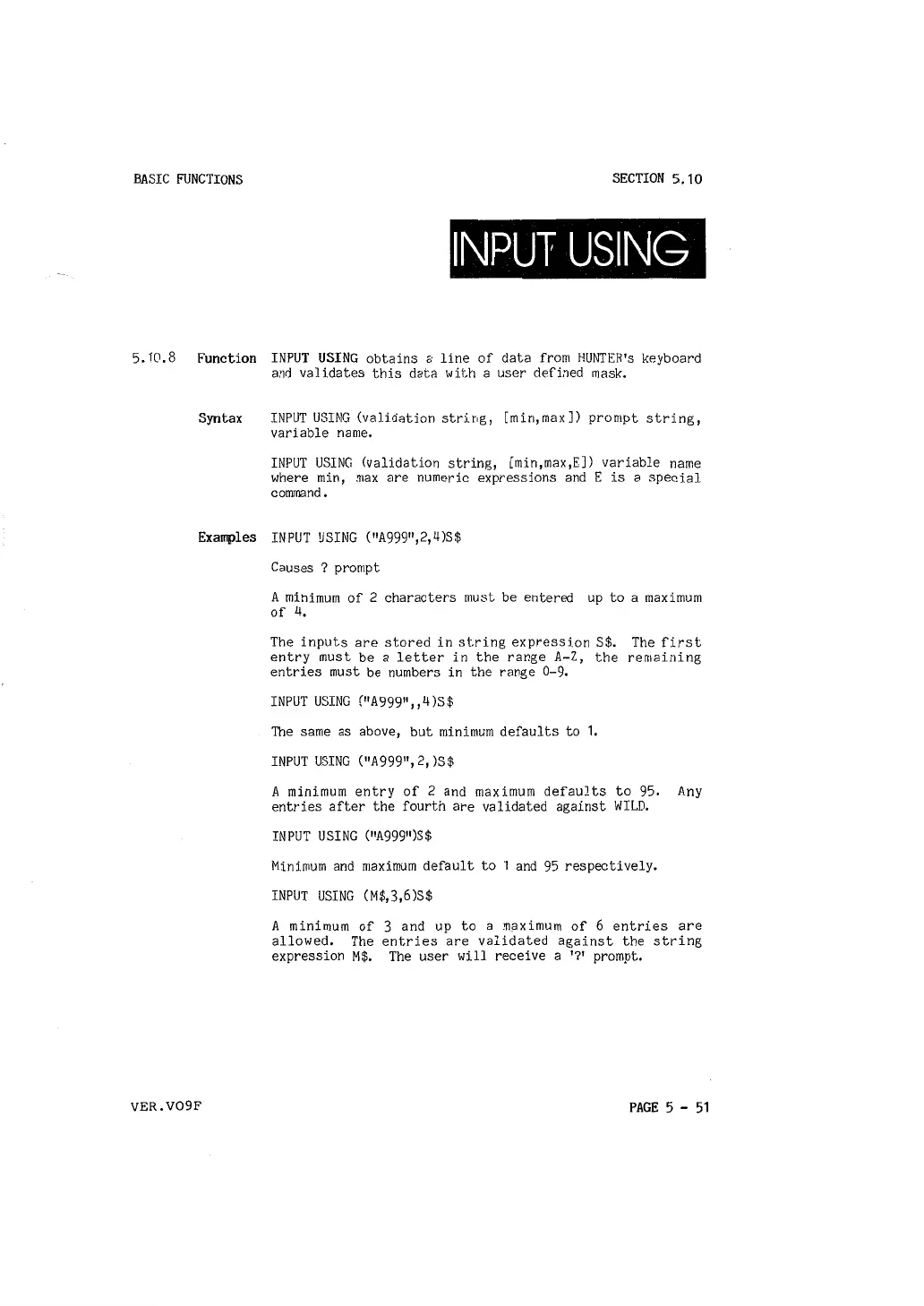 5. 10. 8 Function INPUT USING obtains a line of data from HUNTER's keyboard