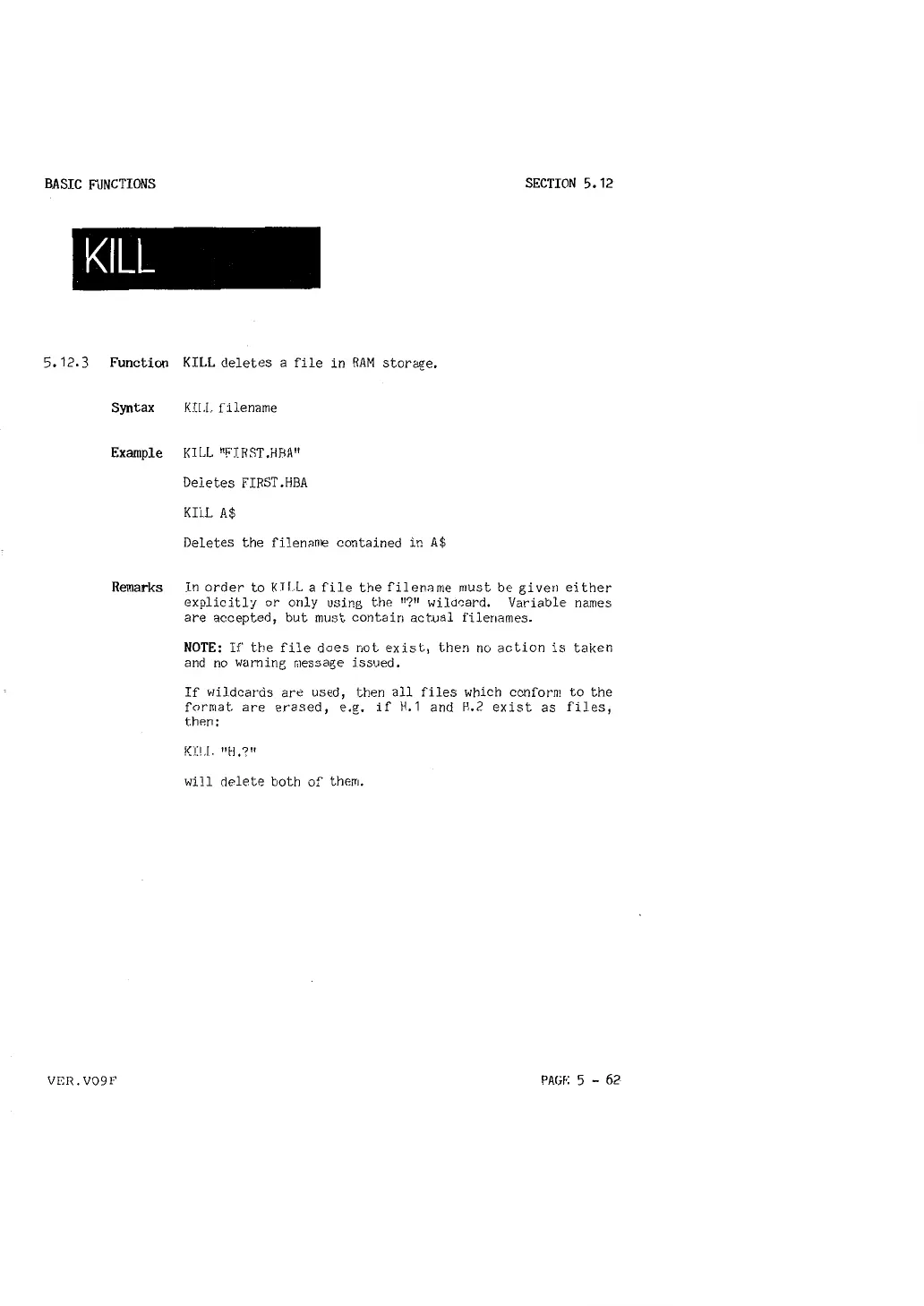 5. 12.3 Function KILL deletes a file in RAM storage,