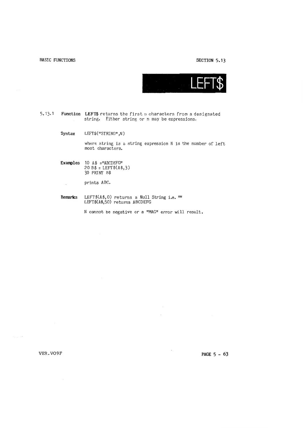 5.13, 1 Function LEFT$ returns the first n characters from a designated