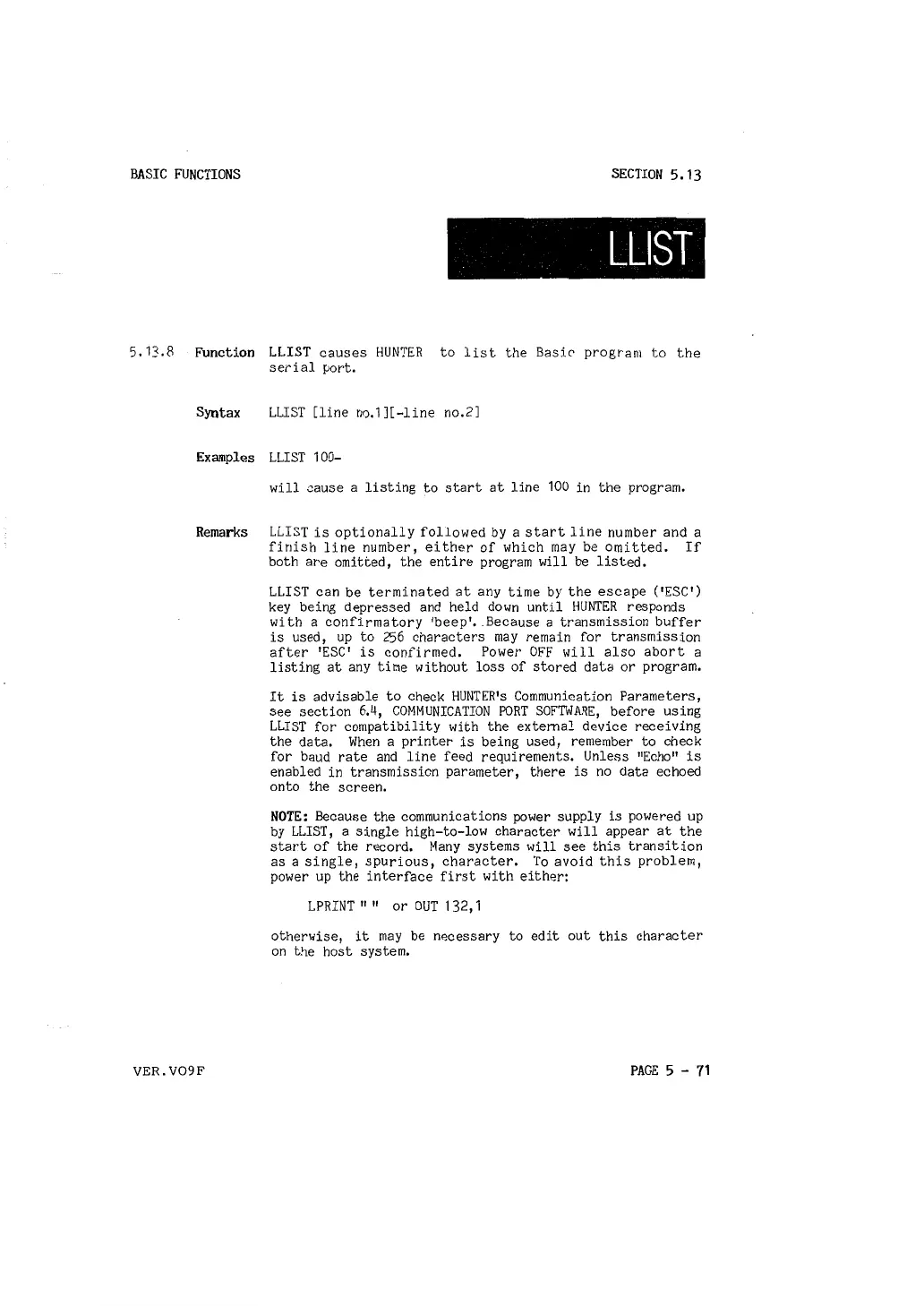 5, 13.8 Function LLIST causes HUNTER to list the BasiC' program to the