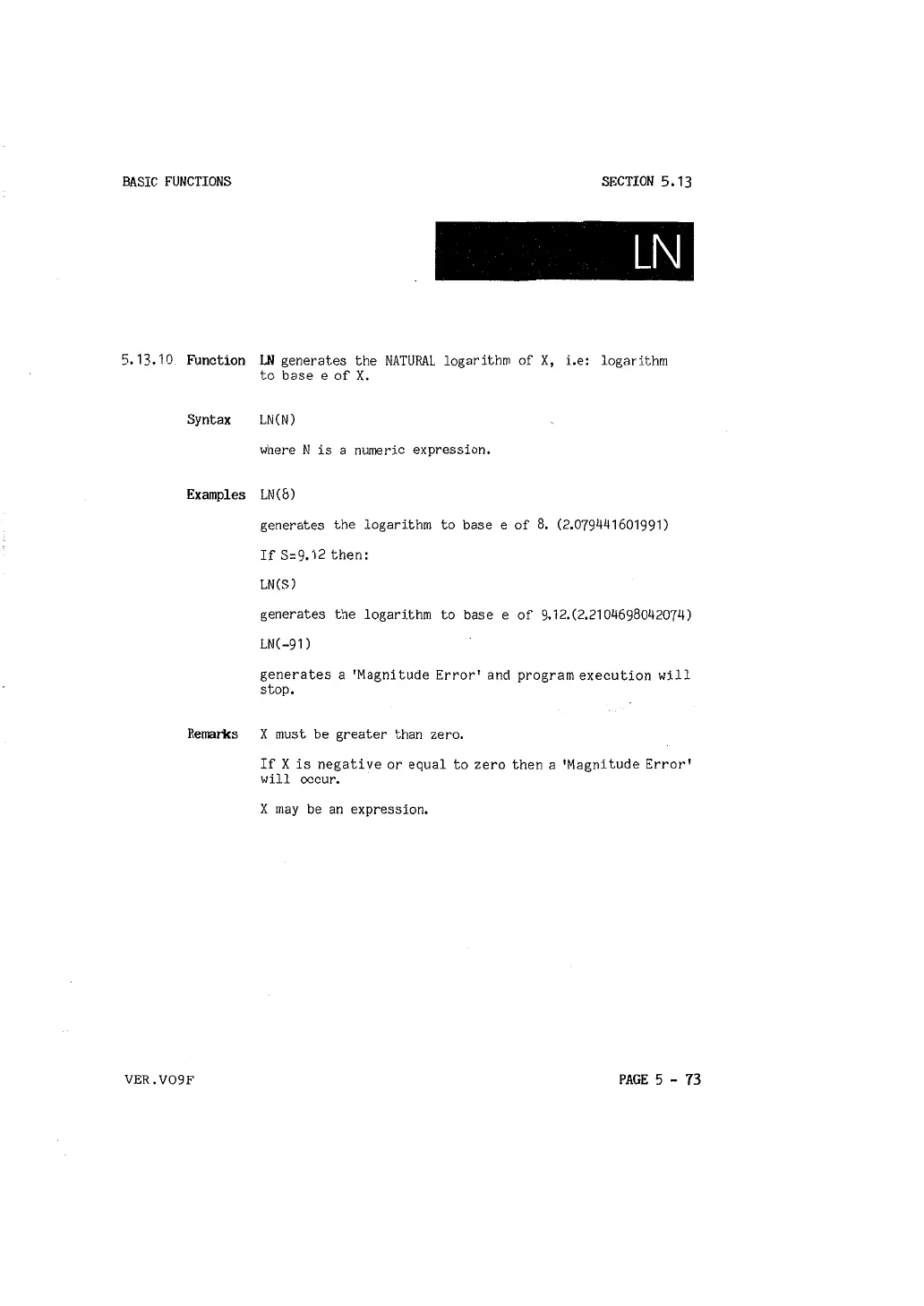 Function I..N generates the NATURAL logarithrn of X, i.e: logarithm