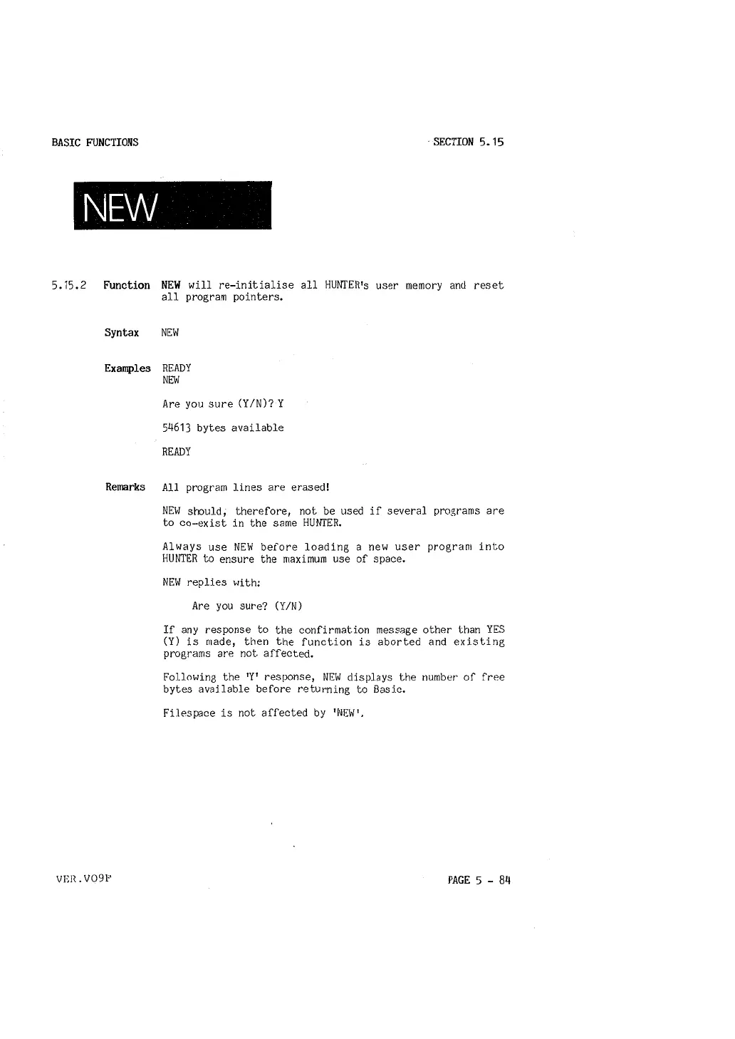 5.15.2 Function NEW will re-initialise all HUNTER's user memory and reset