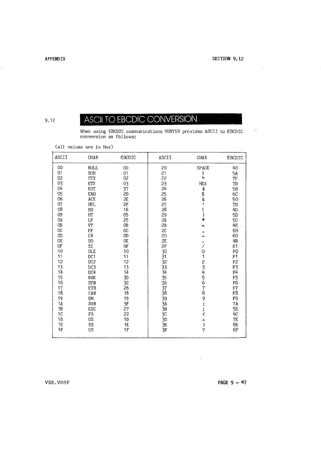When using EBCDIC communications HUNTER provides ASCII to EBCDIC