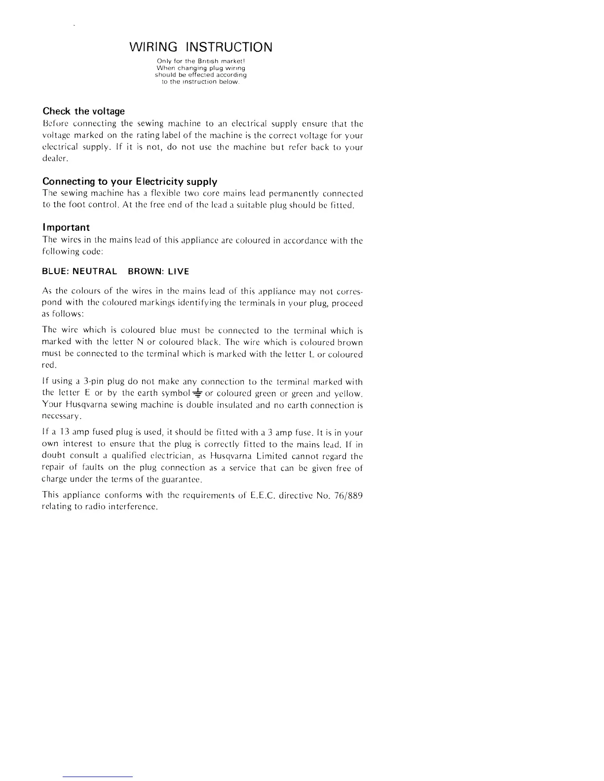 Huskylock 430 - Wiring and Electrical Safety; Voltage Check; Connecting to Power Supply; Wire Color Coding and Insulation