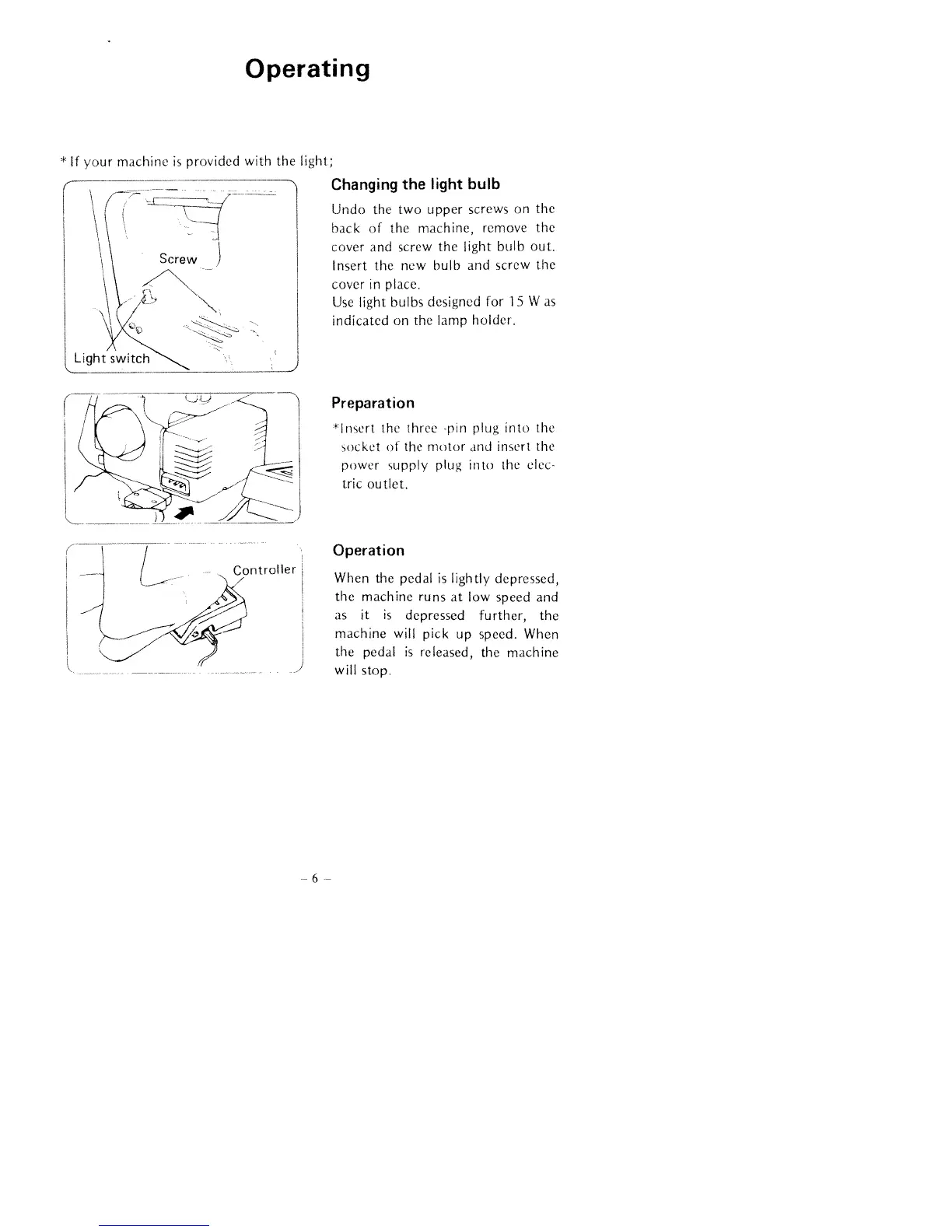 Huskylock 430 - Sewing Machine Operation; Light Bulb Replacement; Power Connection and Preparation; Foot Pedal Operation