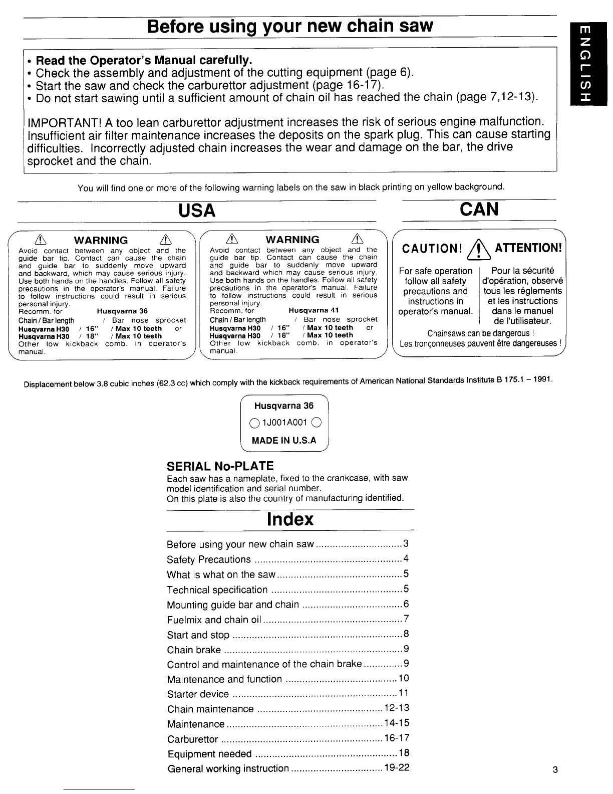 Displacementbelow3.8 cubic inches(62.3cc)whichcomplywiththekickbackrequirementsofAmericanNationalStandardsInstitutaB 175.1– 1991.