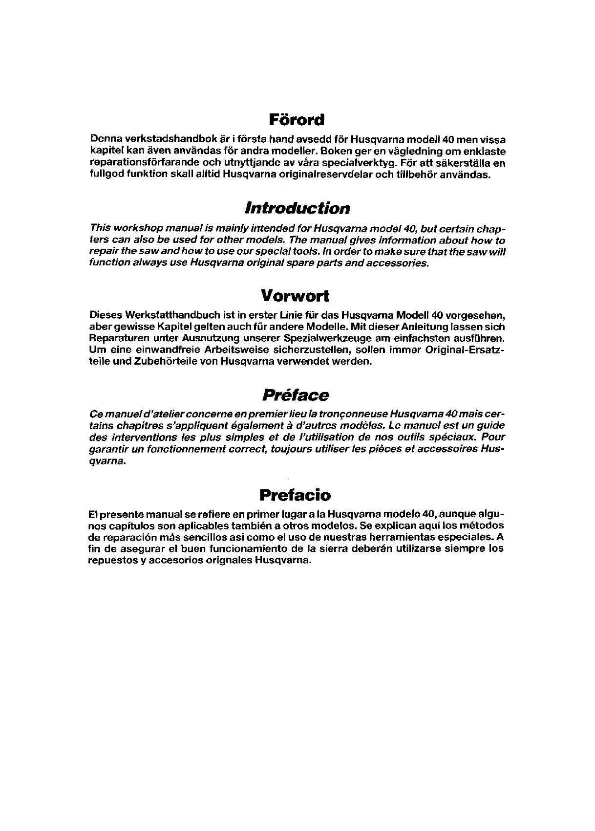 Denna verkstadshandbok ar i forsta hand avsedd for Husqvarna modell 40 men vissa