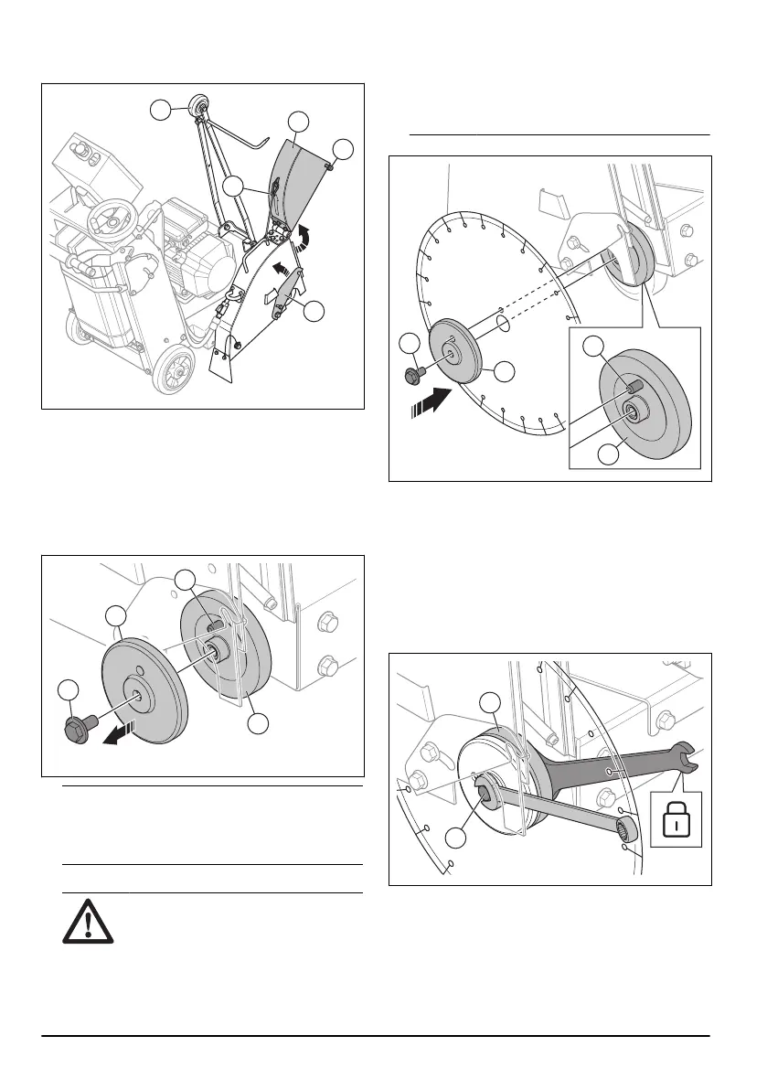 10. Instale el disco de corte en la brida interior (H).