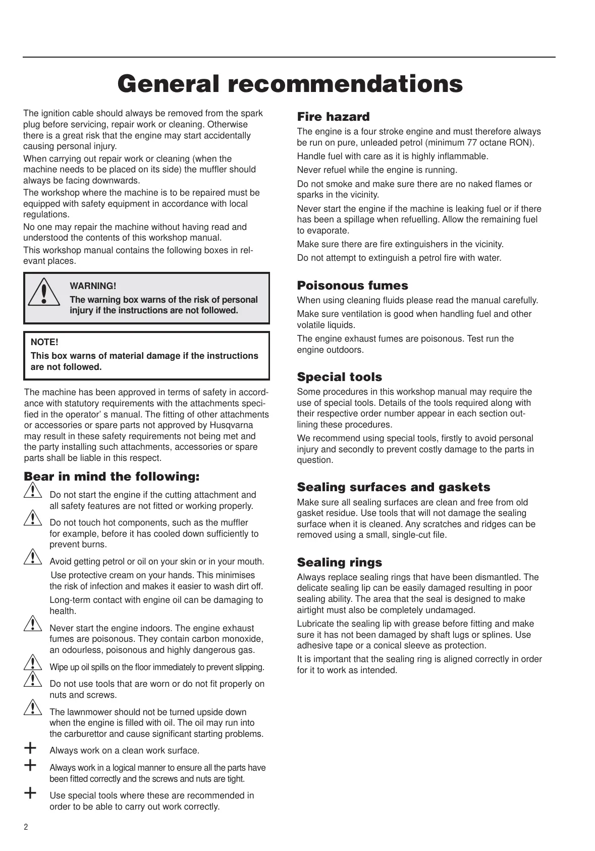 ! Never start the engine indoors. The engine exhaust