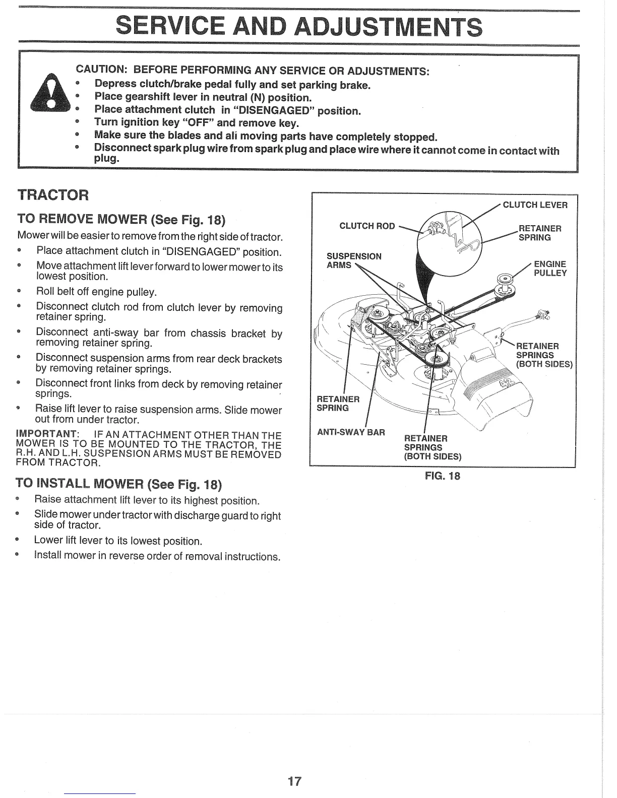 Husqvarna LT155 - Service and Adjustments; Service Safety Precautions; To Remove Mower; To Install Mower