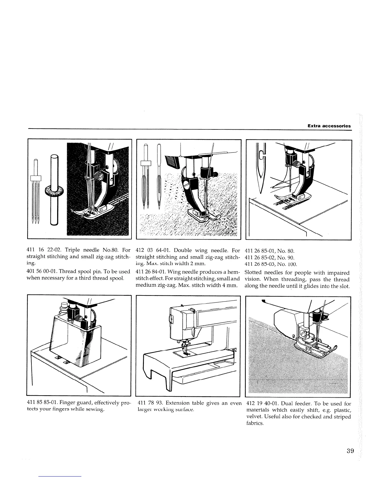 Husqvarna Optima 150 E - Specialized Sewing Accessories; Needles and Thread Spool Pin; Guards, Extension Tables, and Feeders