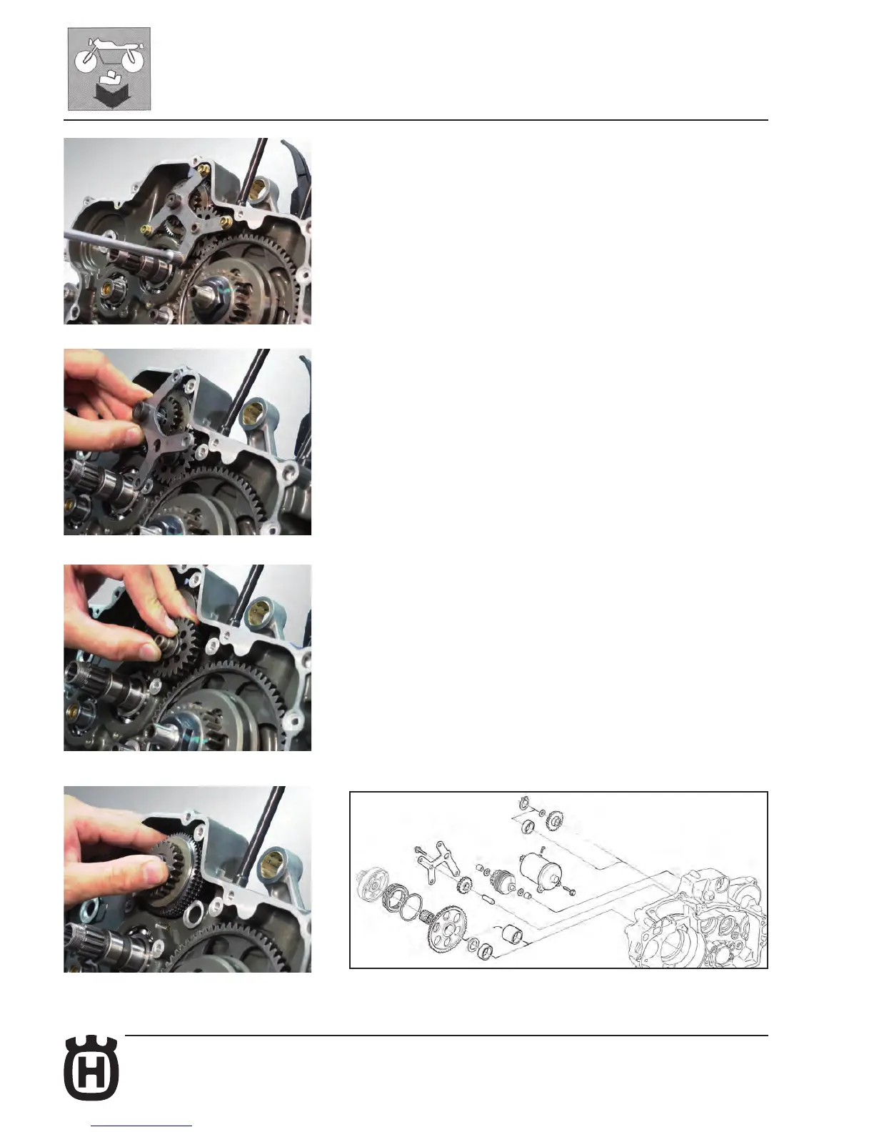 Remove the four fastening screws (8 mm wrench) and starting gears retaining
