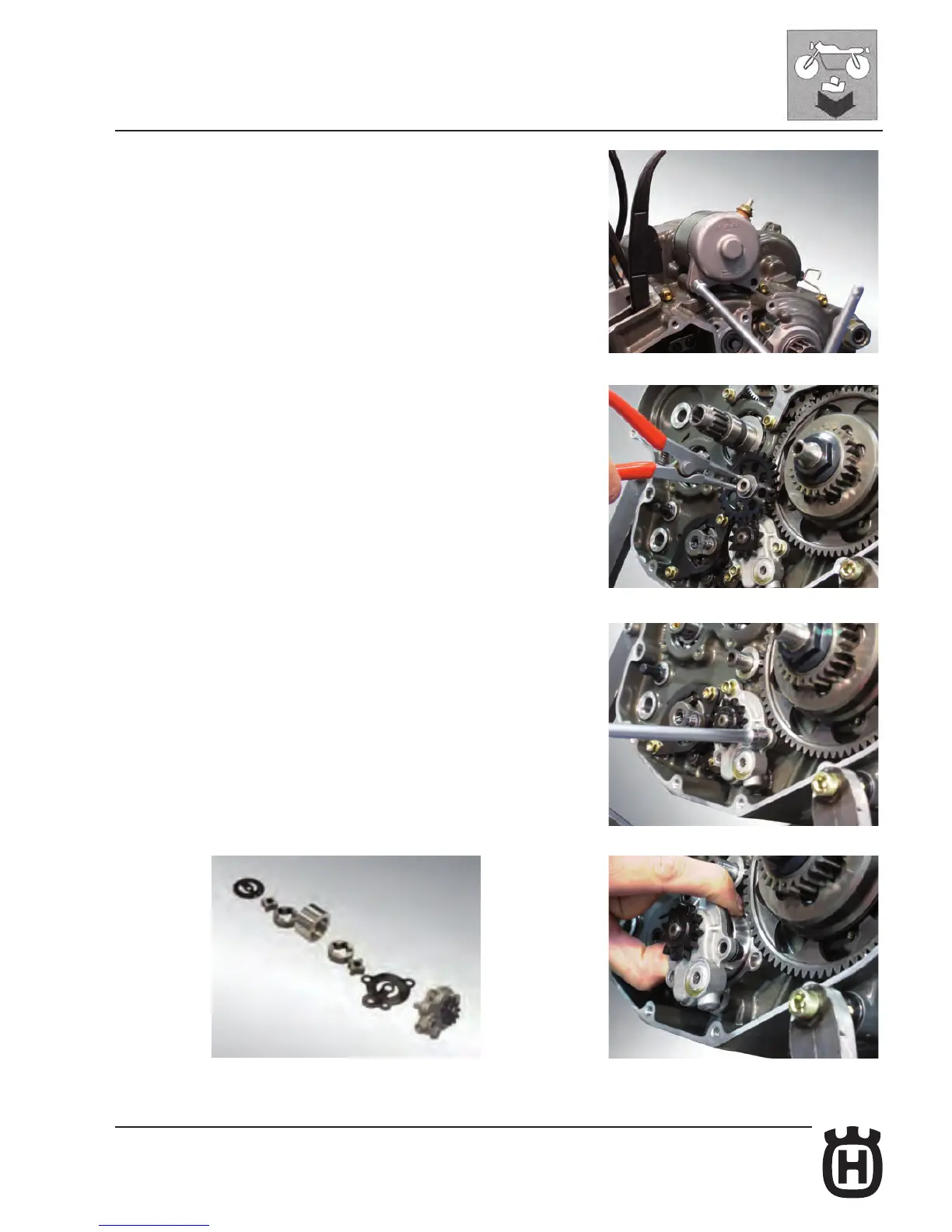 Using pointed pliers, remove the oil pump idle gear circlip, then the idle gear.
