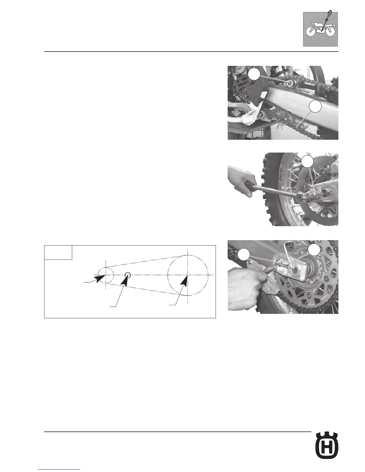 line up the drive sprocket axle, the rear swing arm axle and the rear wheel axle