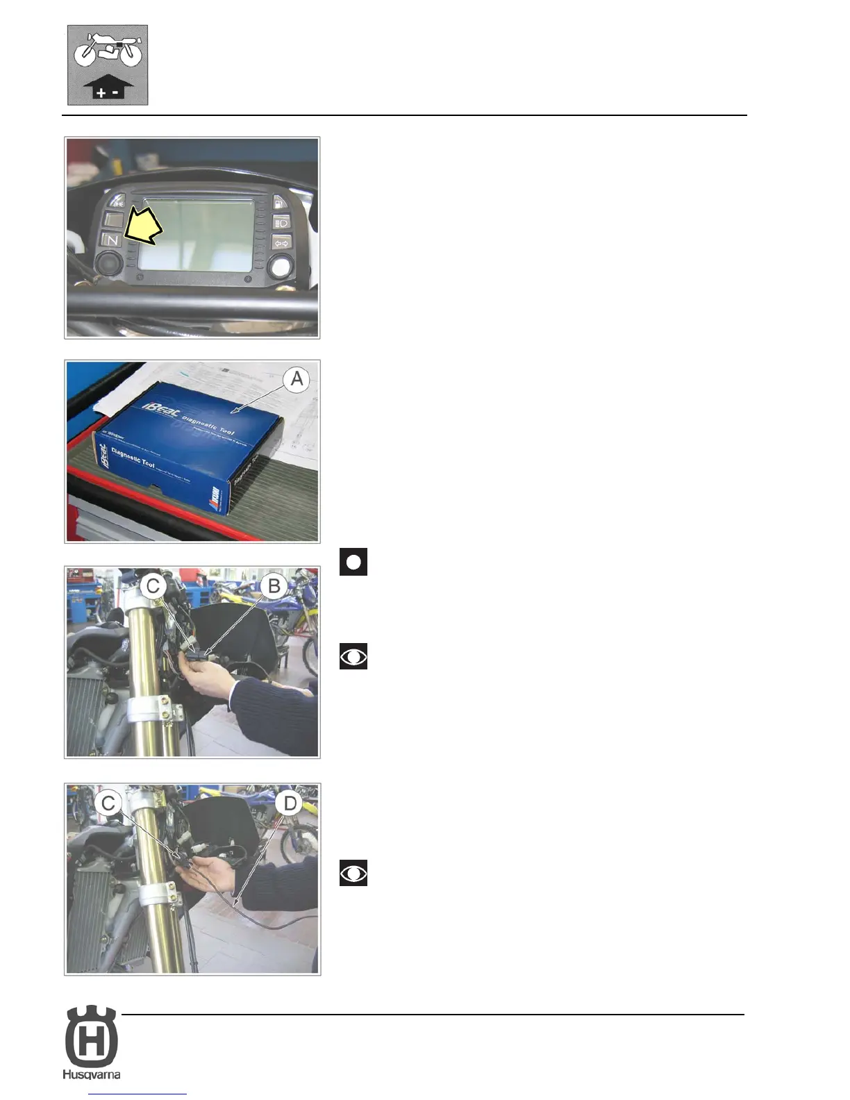 - girar la llave de encendido (F) en posición ON y poner el conmutador derecho (G) en