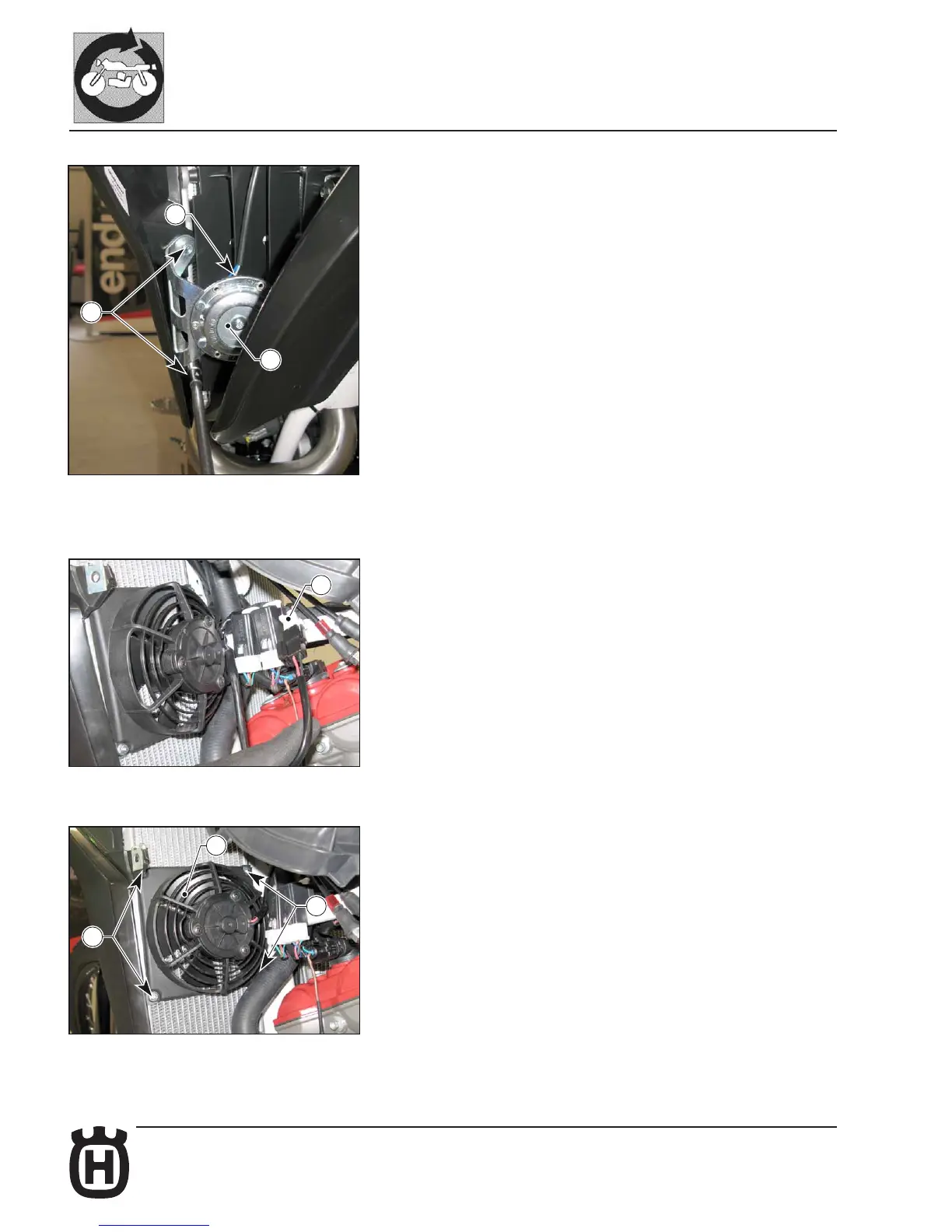 - Loosen the four screws (2) (with a 7 mm wrench), and remove electric fan