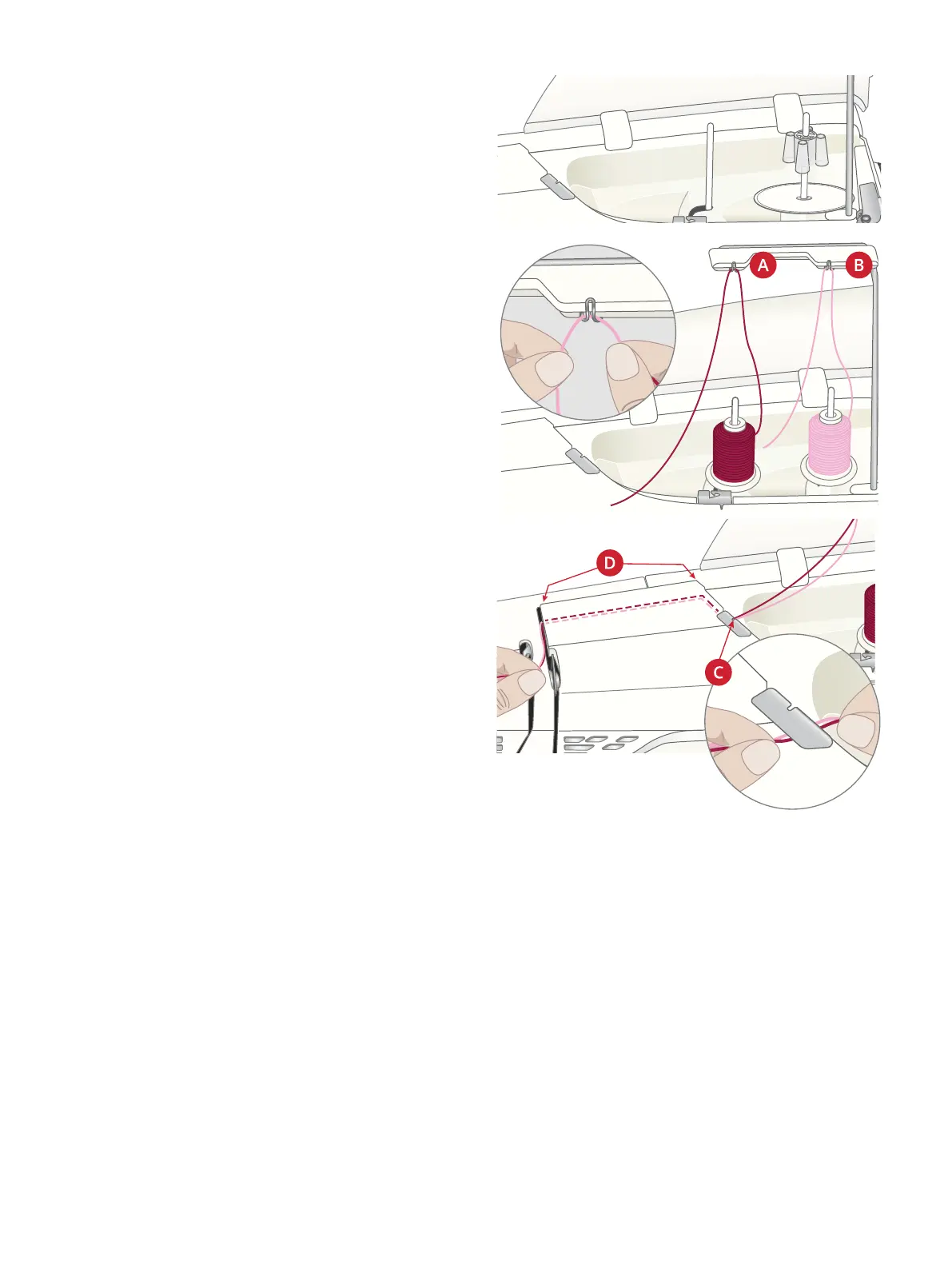 Note: Continue to hold the threads lightly next to the thread guide