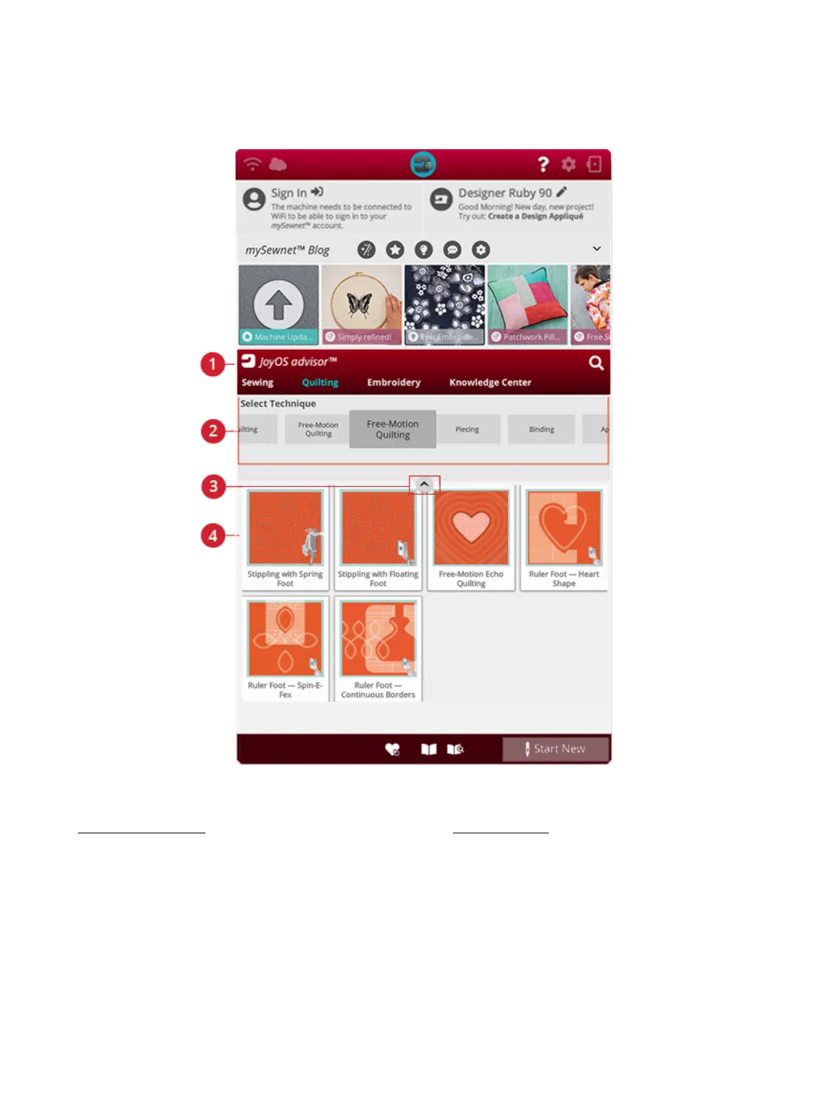 Touch a quilting technique group and the JoyOS ADVISOR™ feature will show available quilting techniques in that group.