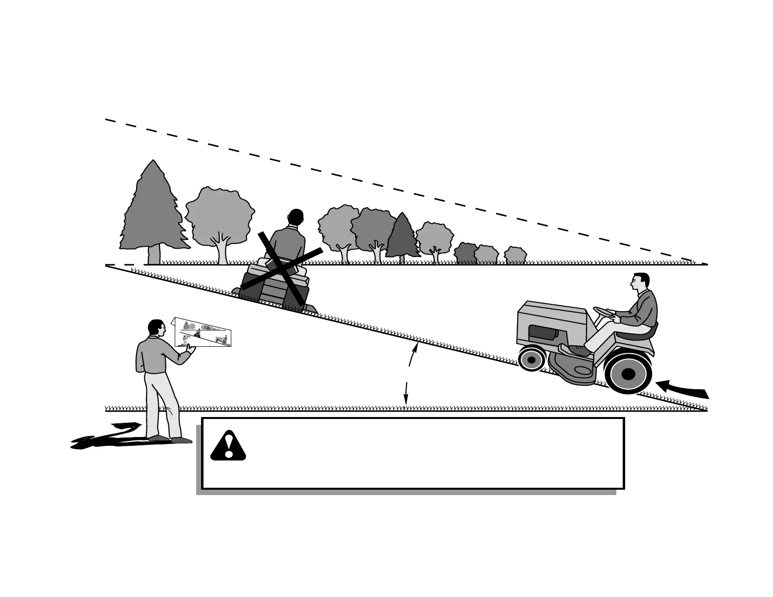 down the face of slopes, never across the face. Do not mow