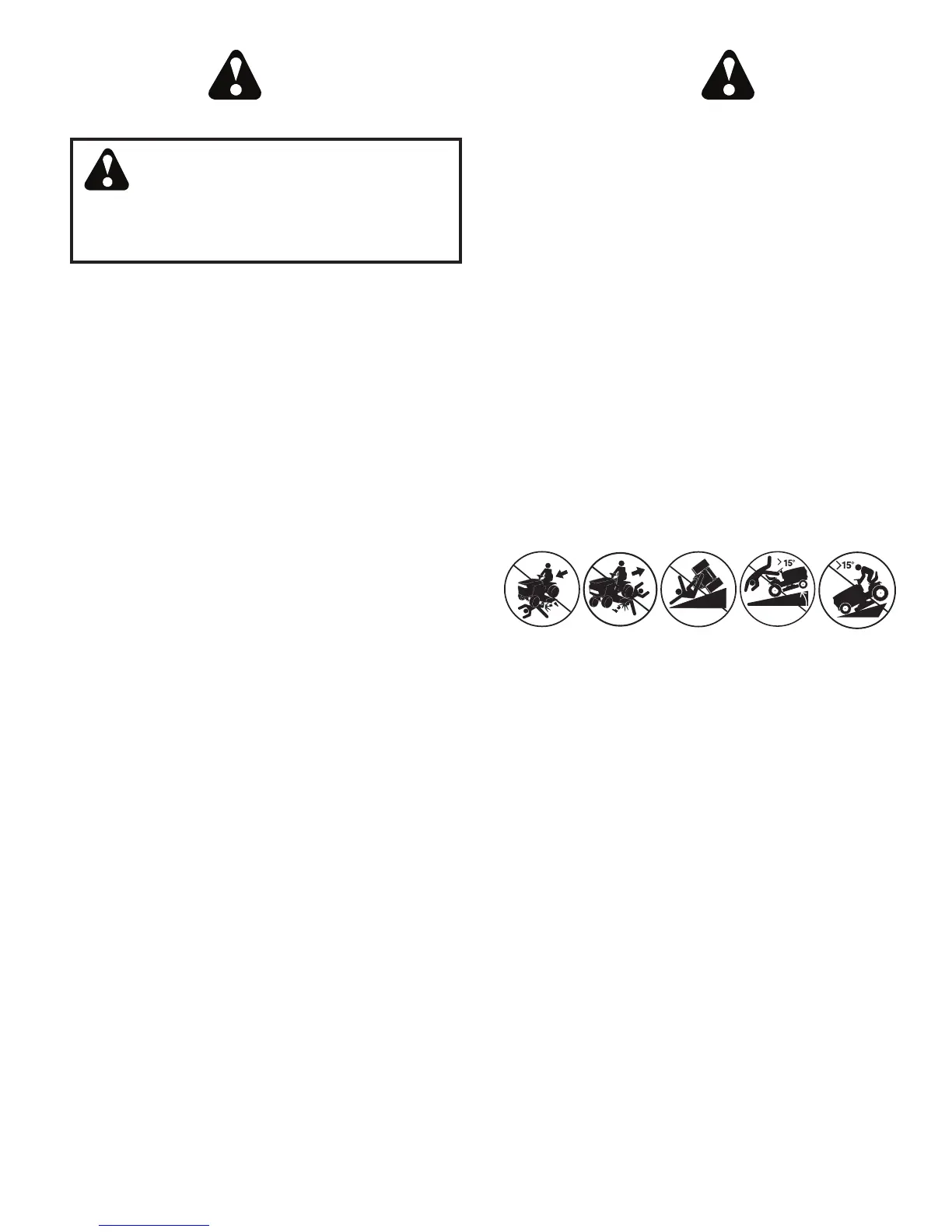 • Avoid starting, stopping, or turning on a slope. If the tires
