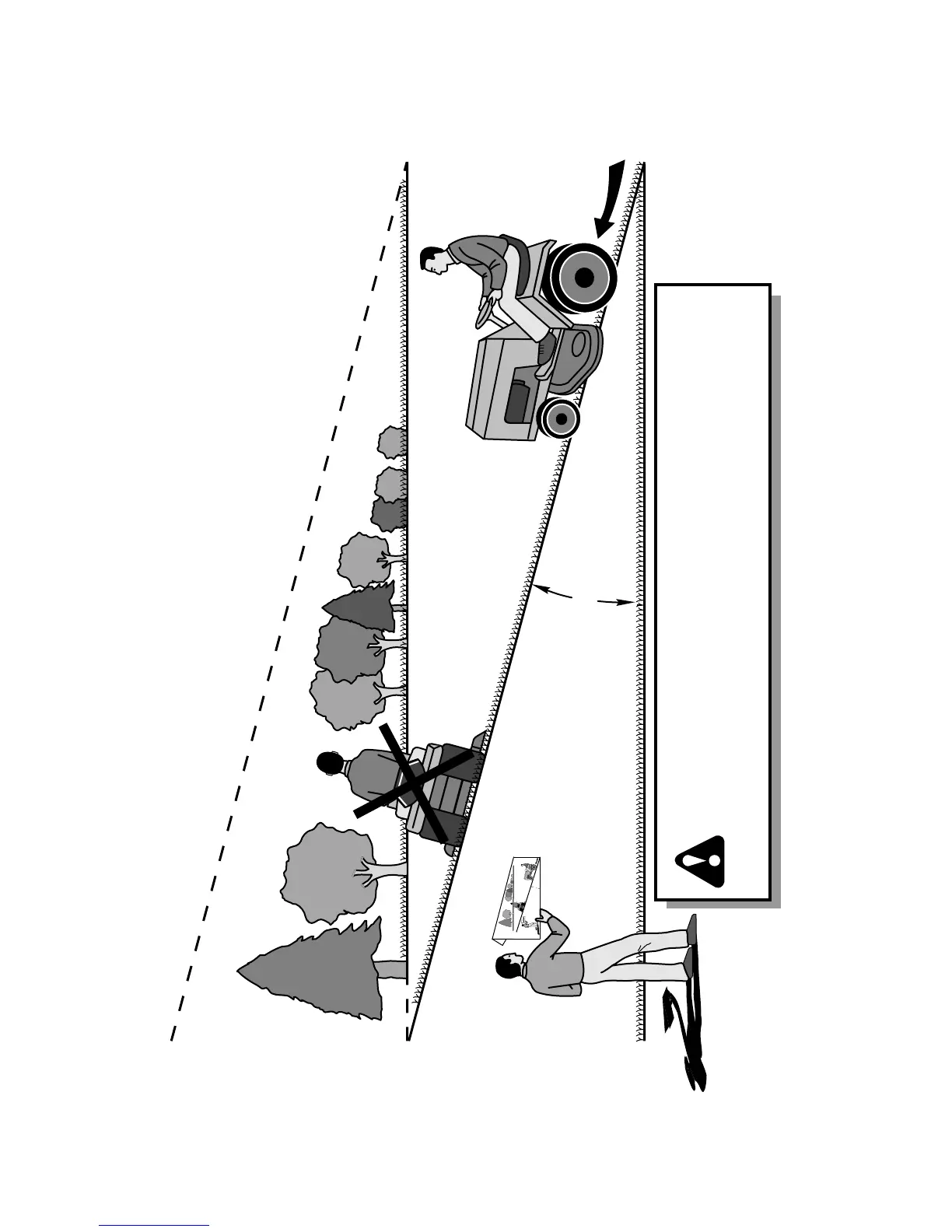 down the face of slopes, never across the face. Do not mow
