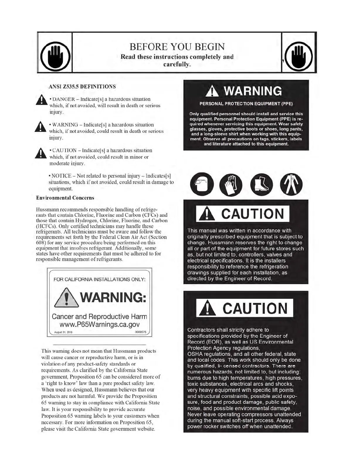 Hussmann Krack MS Series - Safety and General Information; Safety Definitions and PPE; Environmental Concerns and Compliance