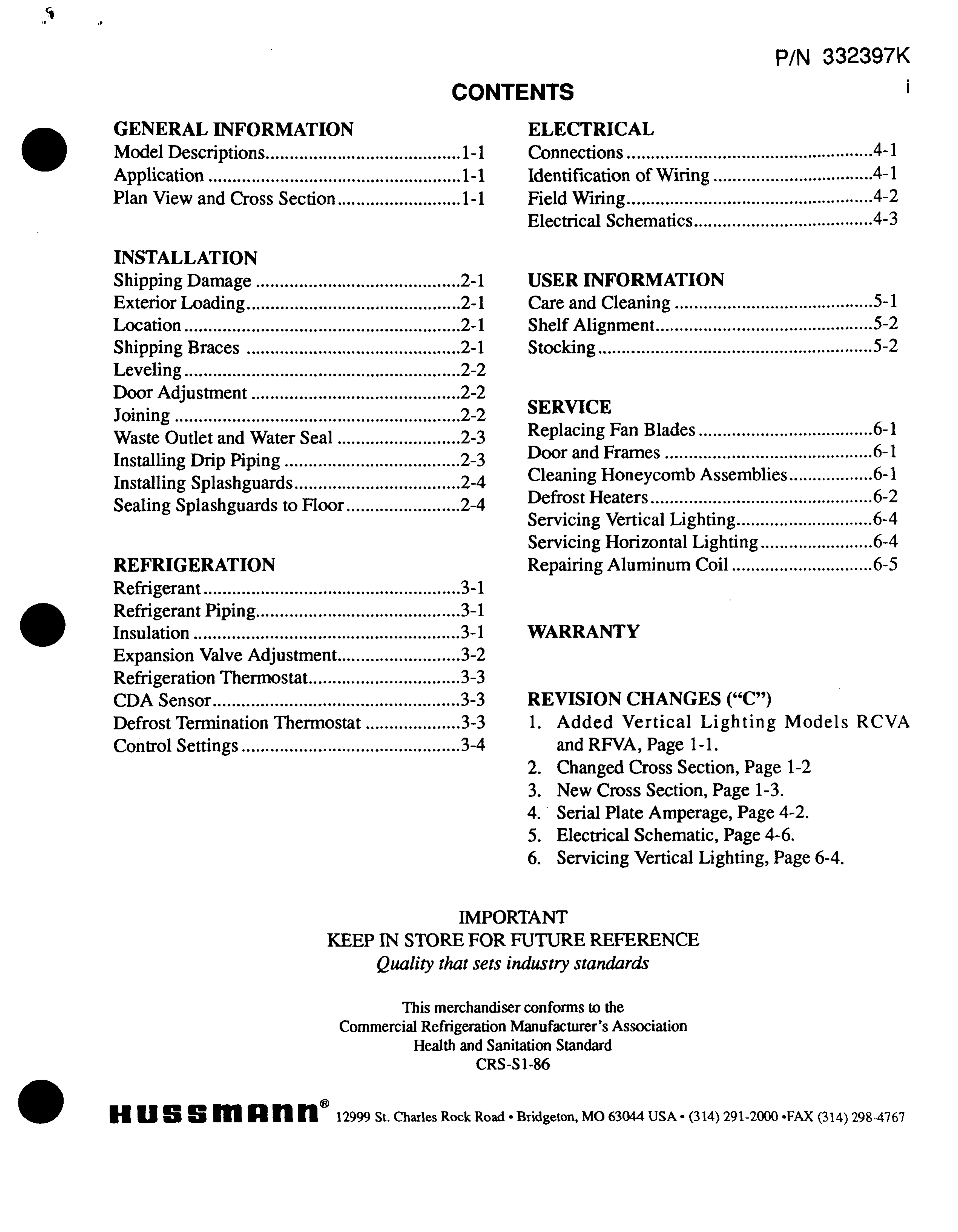 Hussmann RCA - Replacement Parts List; Fans; Electric Defrost Heaters; Front Pan Heater-Rod