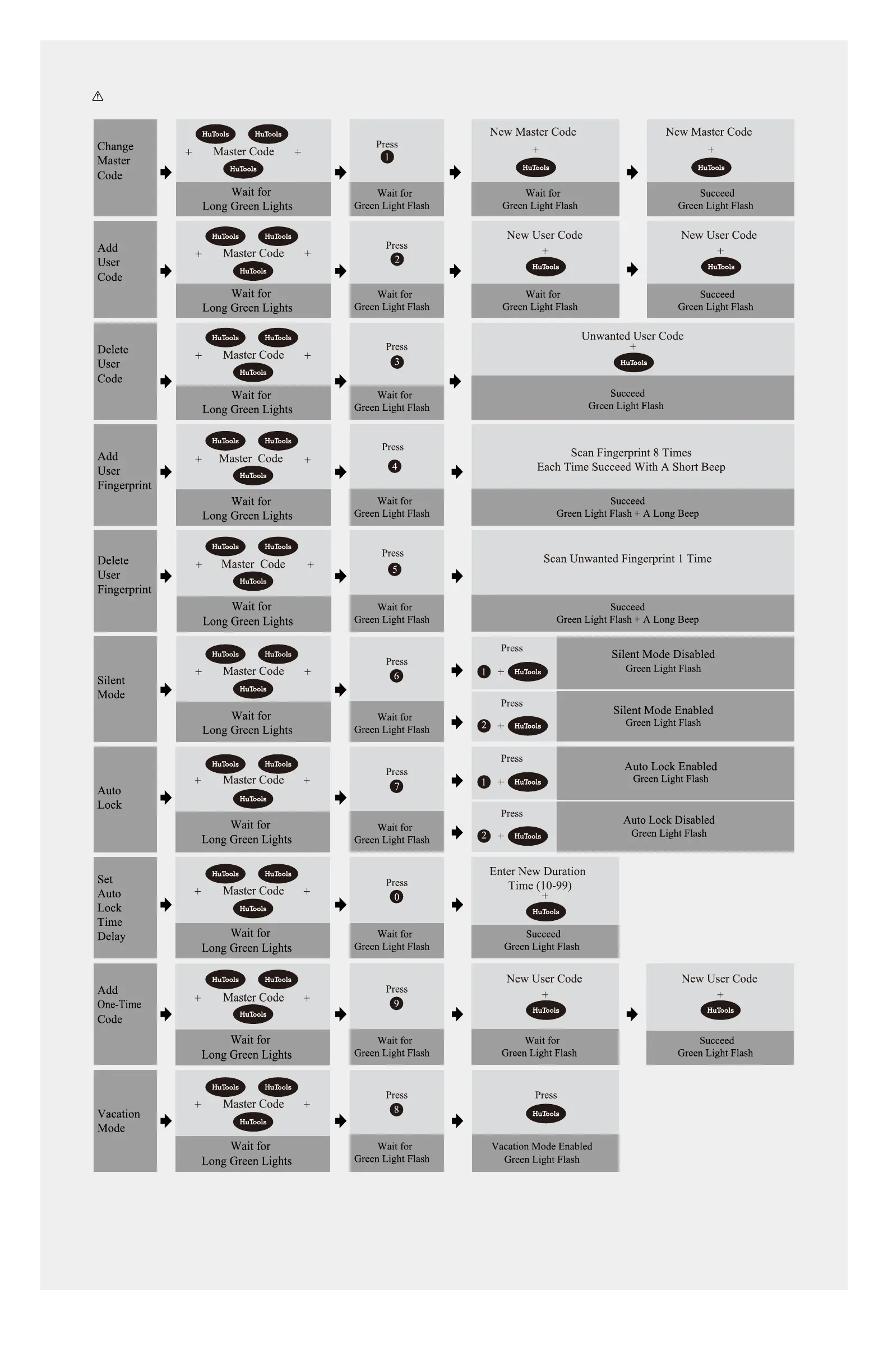 HuTools HT02 - Quick Set Up; Change Master Code Procedure; Add and Delete User Access; Configure Lock Modes and Settings