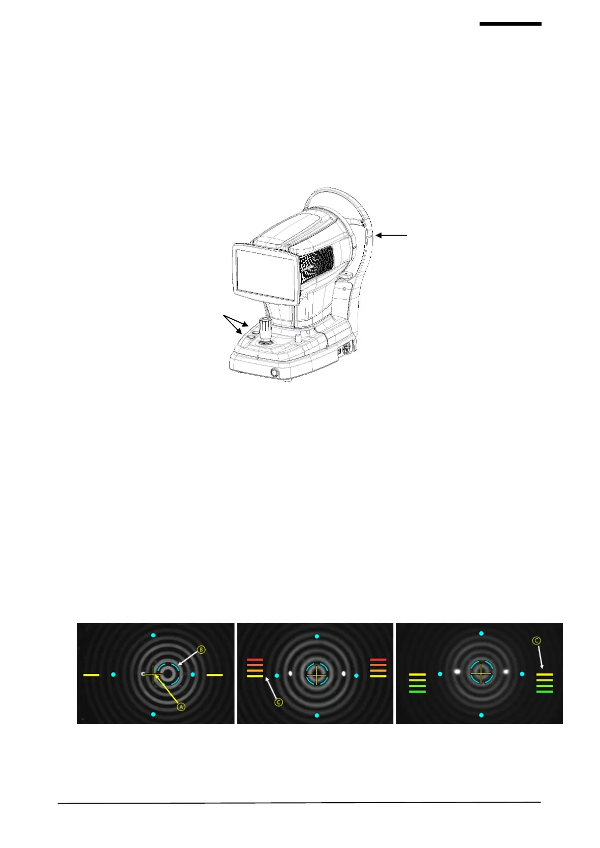 (1) Move the body up/down and left/right with joystick until center of placido-ring (A) and center of cross (B) are