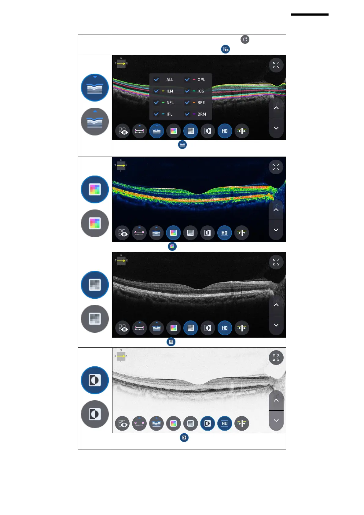 - Selecting Color icon ( ) displays Bscan image in pseudo color.