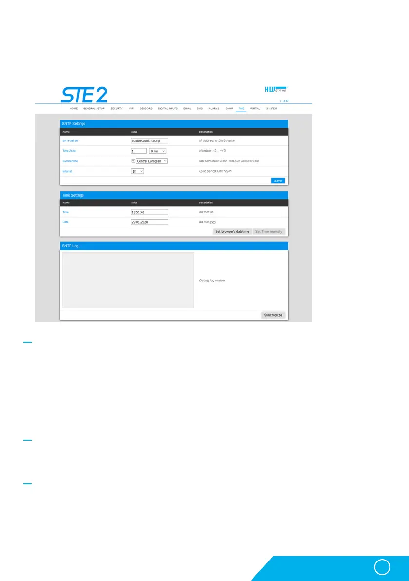 • SNTP Server – IP address or domain address of the time synchronisation server; default time.