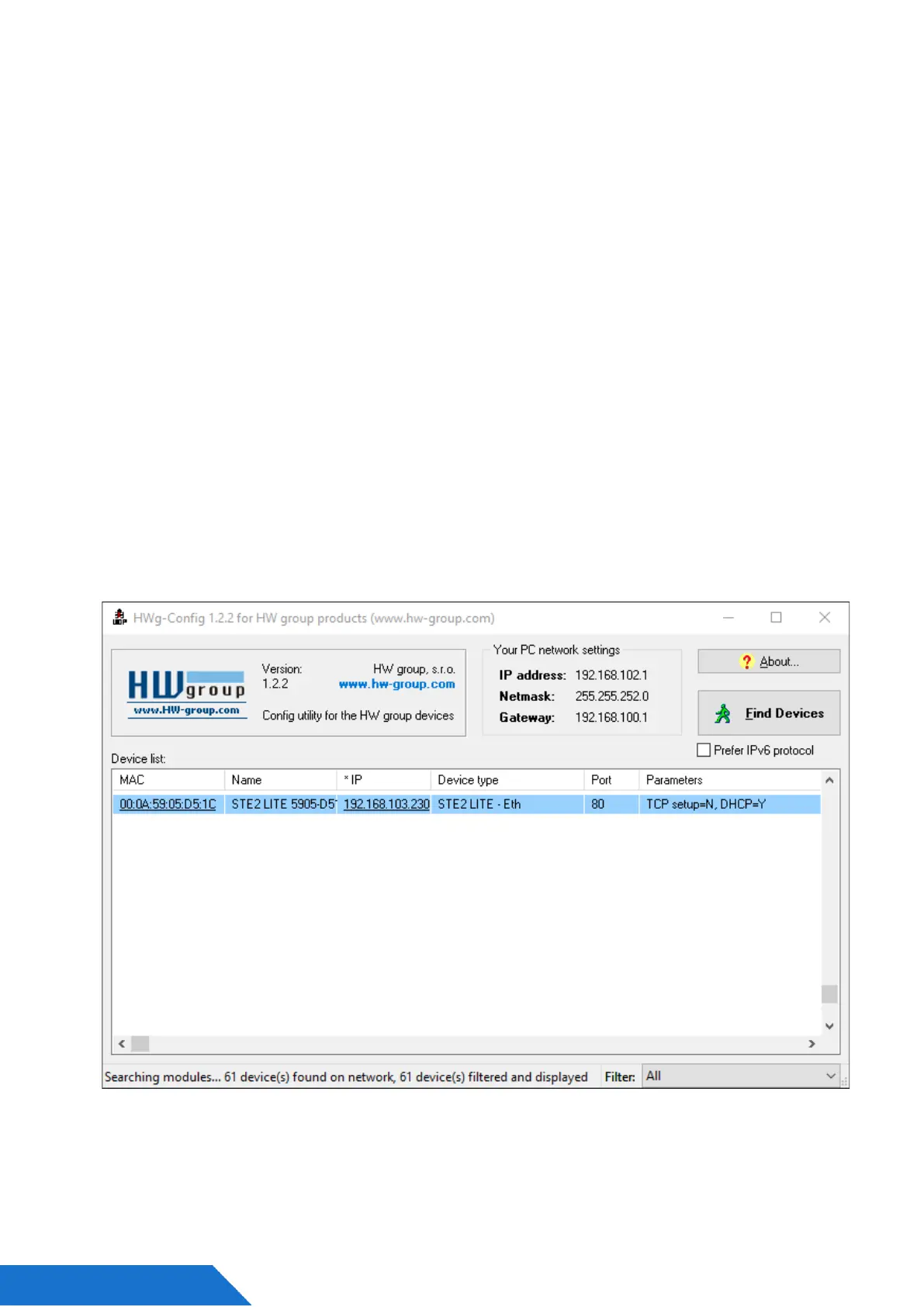 Launch HWg-Config, program automatically searches for LAN connected devices.