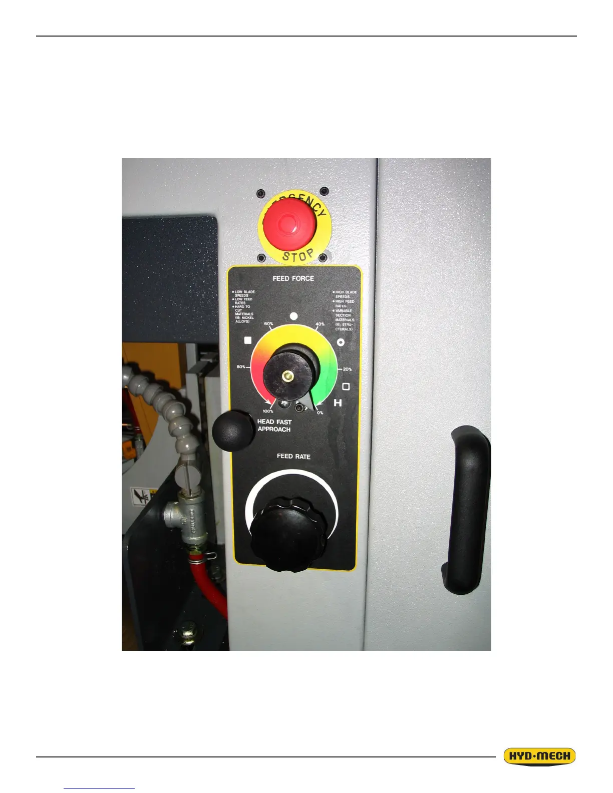 The FEED FORCE VALVE (FFV) sets the degree of slow down as the blade encounters resistance from the work piece.