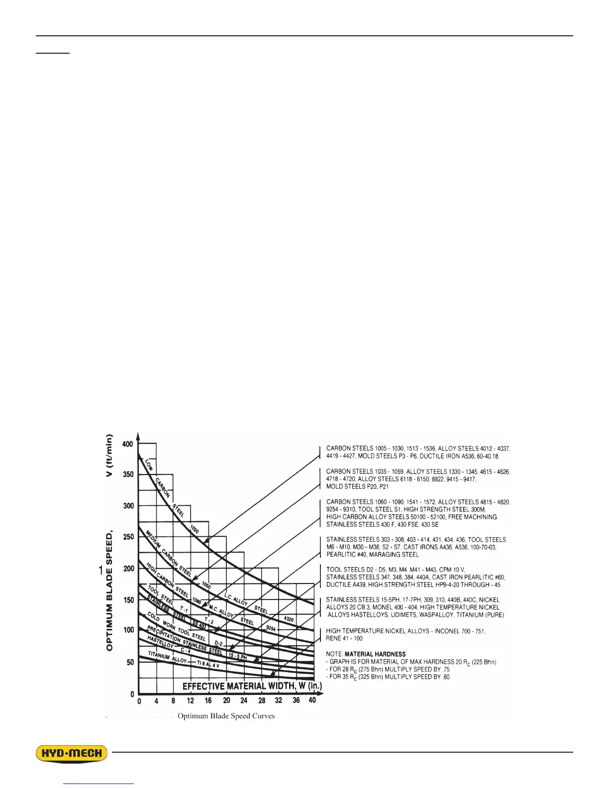 2. Material Hardness - The graph illustrates blade speed curves for materials of hardness 20 RC (225 Bhn) or lower.