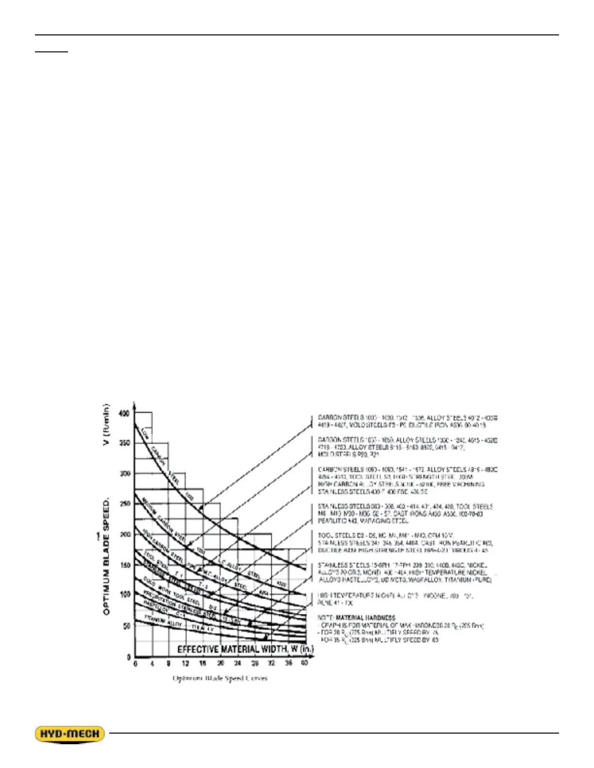 2. Material Hardness - The graph illustrates blade speed curves for materials of hardness 20 RC (225 Bhn) or lower.