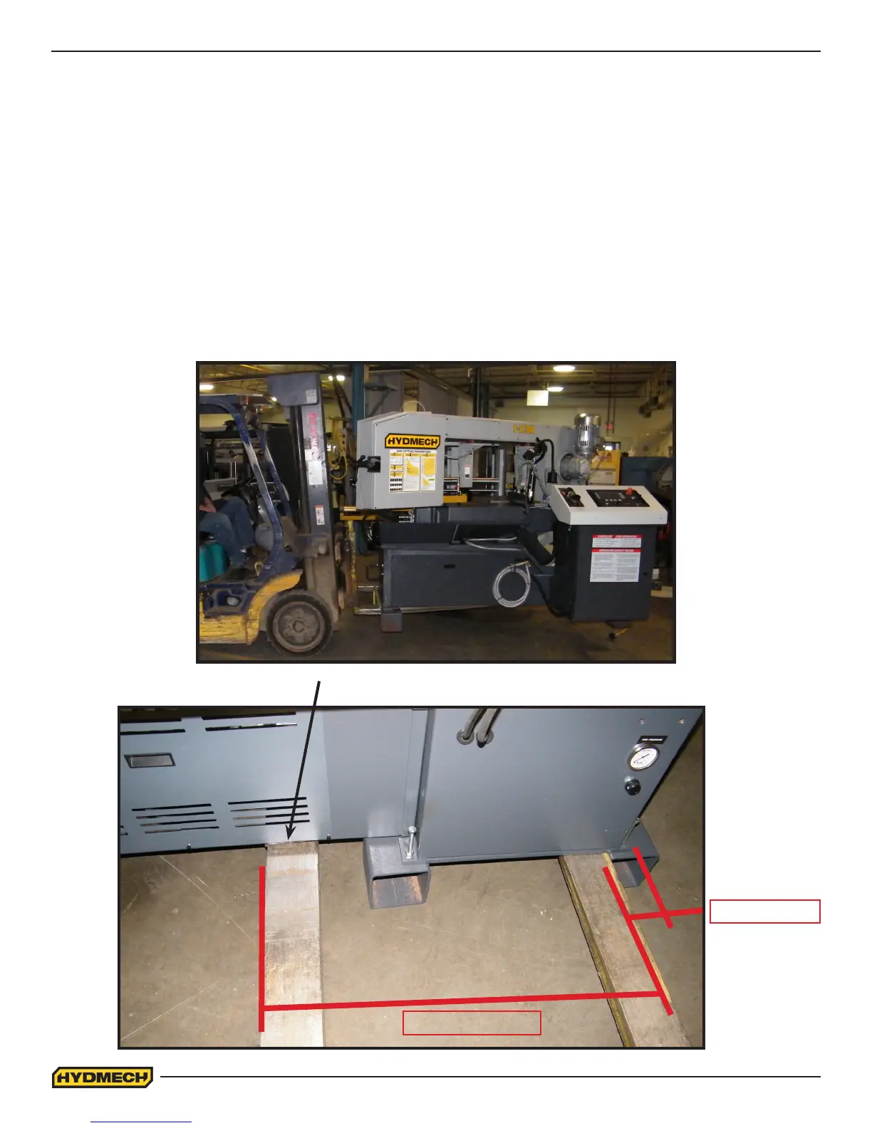 The machine should be lifted from the SIDE as shown below. Forklift spacing should be 36” (914mm). The right fork