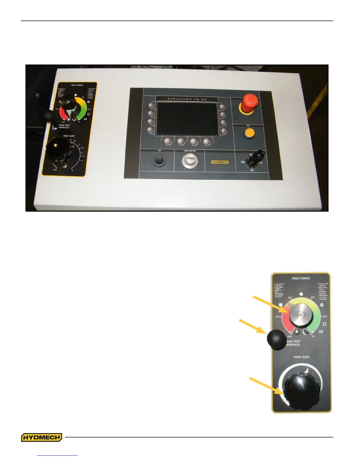 The hydraulic feed controls are located on the left side of the control console and consist of the Feed Force Setting knob,