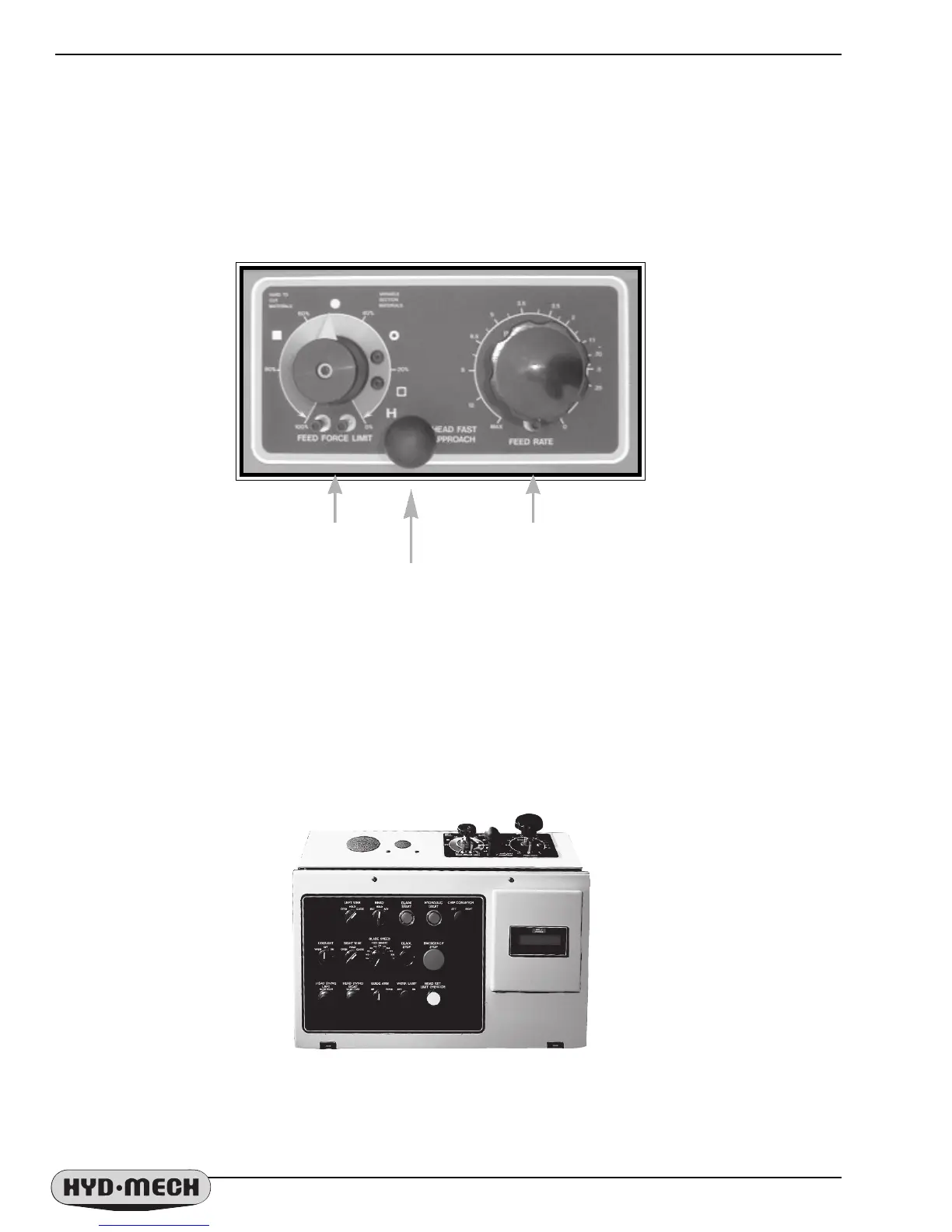 The hydraulic feed controls are located above and behind the electrical panel and consist of the Feed Force