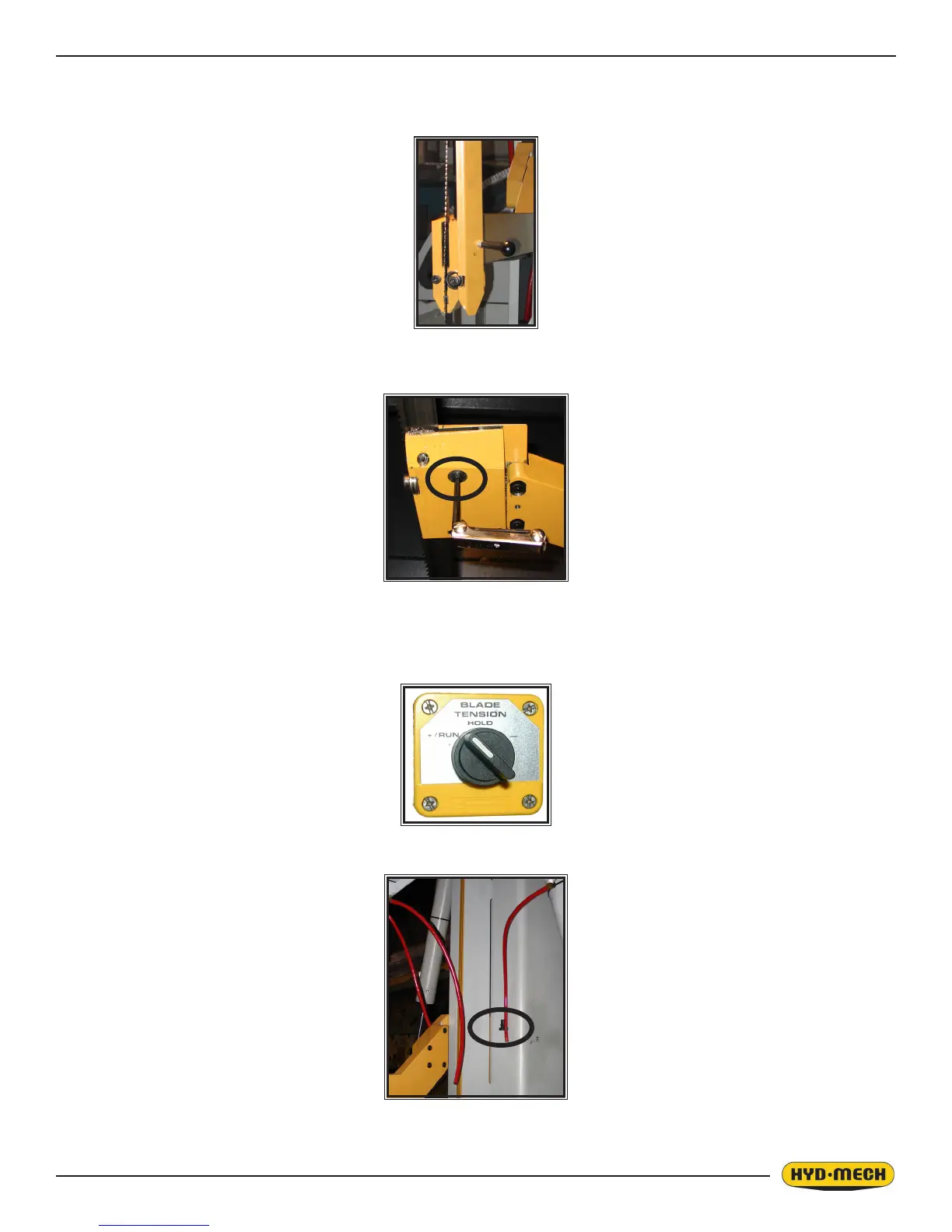 7. Turn the Blade Tension Switch from the TIGHTEN position “ + RUN”, through the unmarked, central HOLD posi-