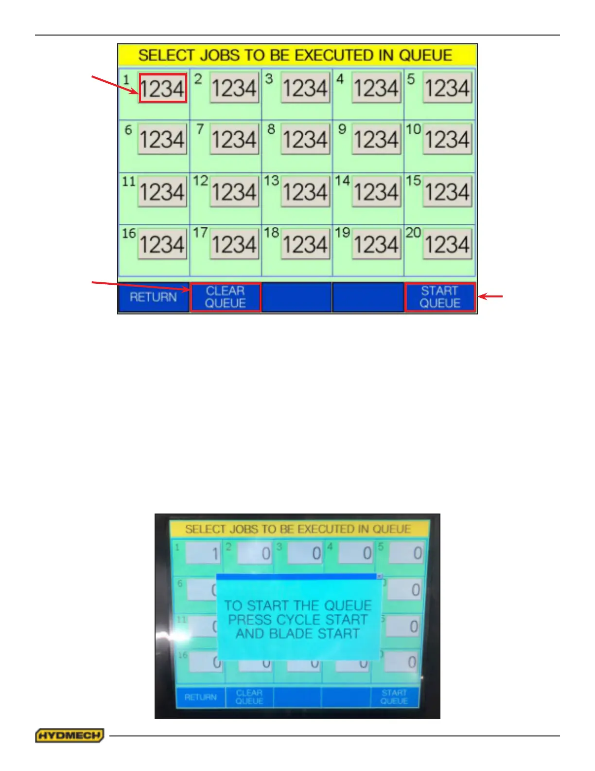 appear and a display window will prompt to initiate the job queue by pressing cycle start on the keypad. Press the “Cycle