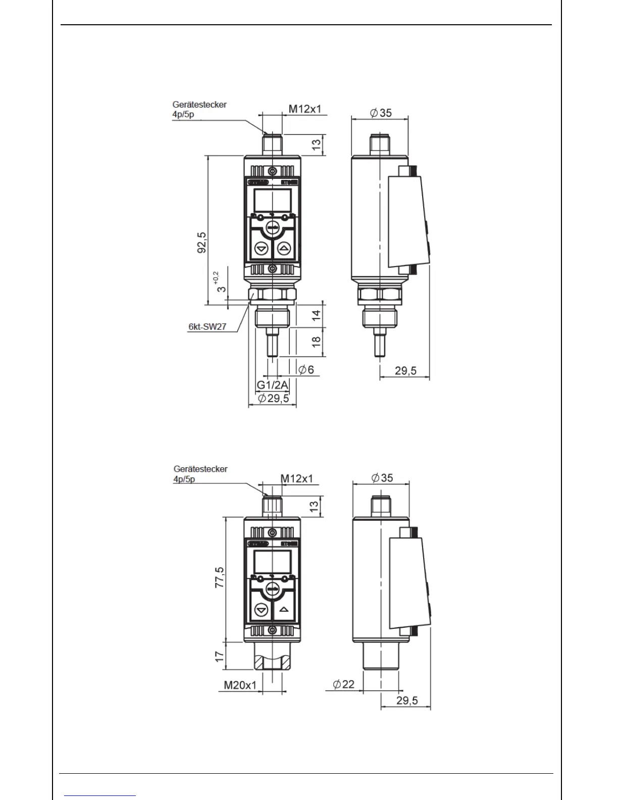HYDAC ELECTRONIC ETS 300 - 15 Geräteabmessungen; Ets 320 mit Integriertem Temperatursensor; Ets 380 mit Separatem Temperatursensor Tfp 100