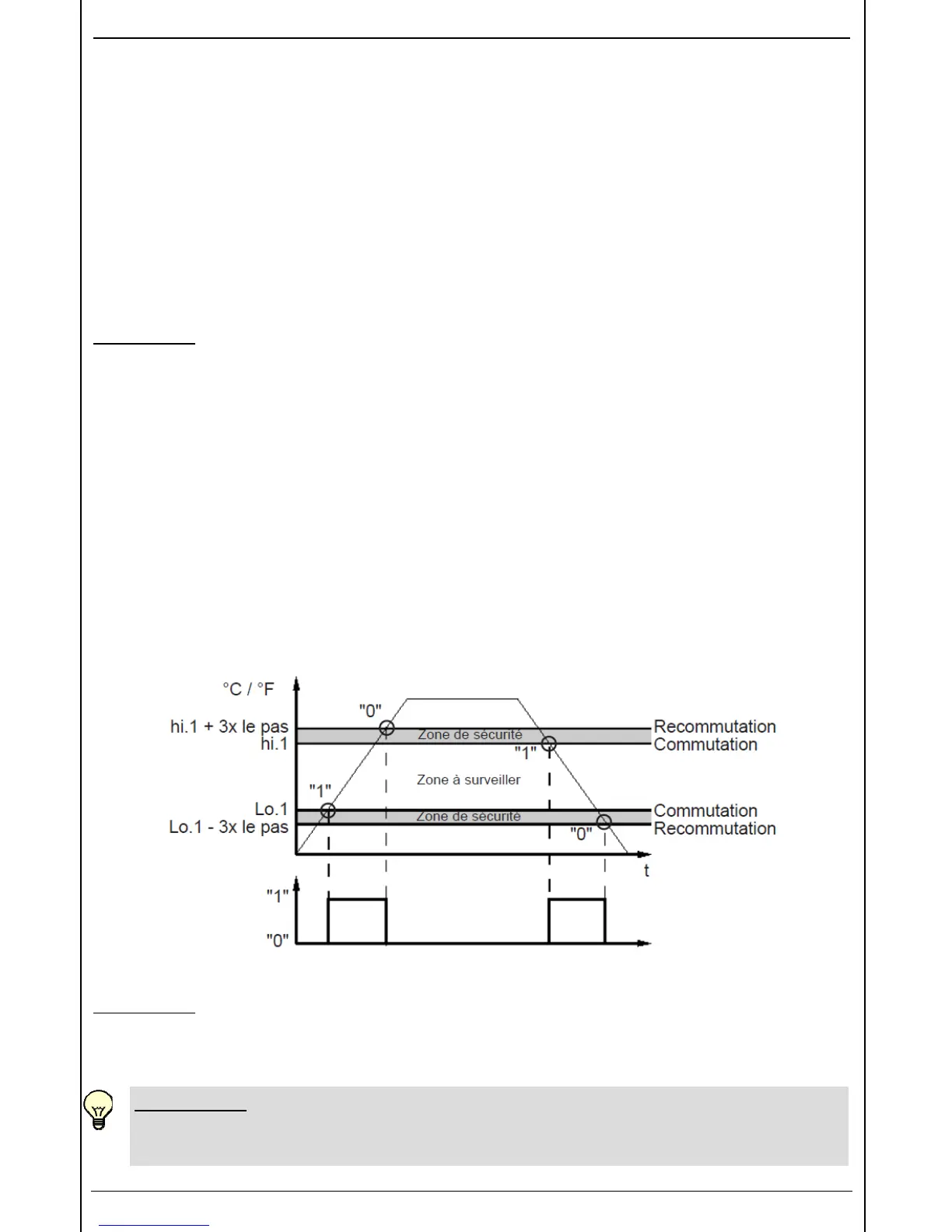 La sortie concernée commute quand la température entre dans la zone ( > Lo.X). Lorsque la