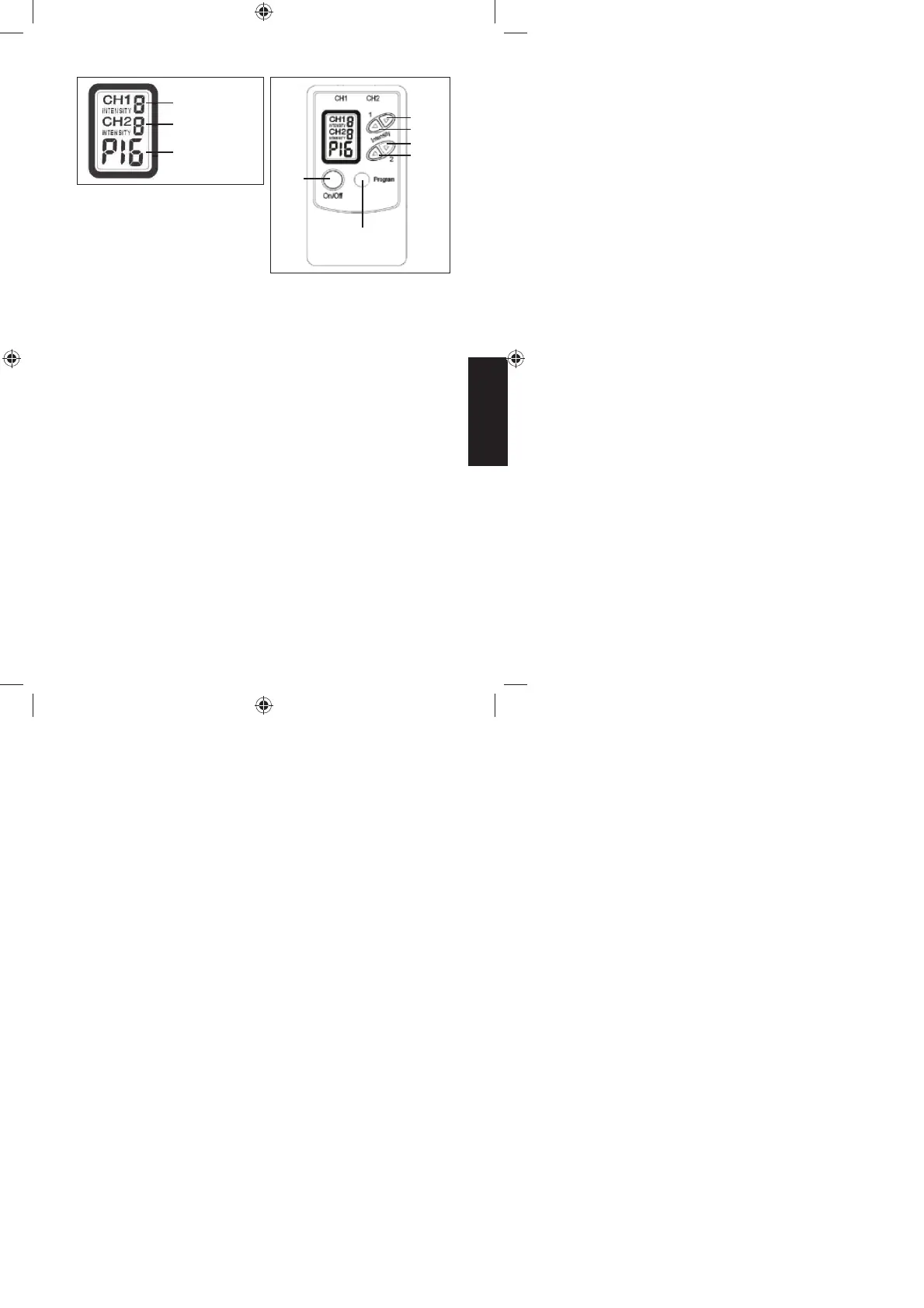 CH2(+): Op toets drukken om de sterkte van kanaal 2 van 0 tot 9 te verhogen.