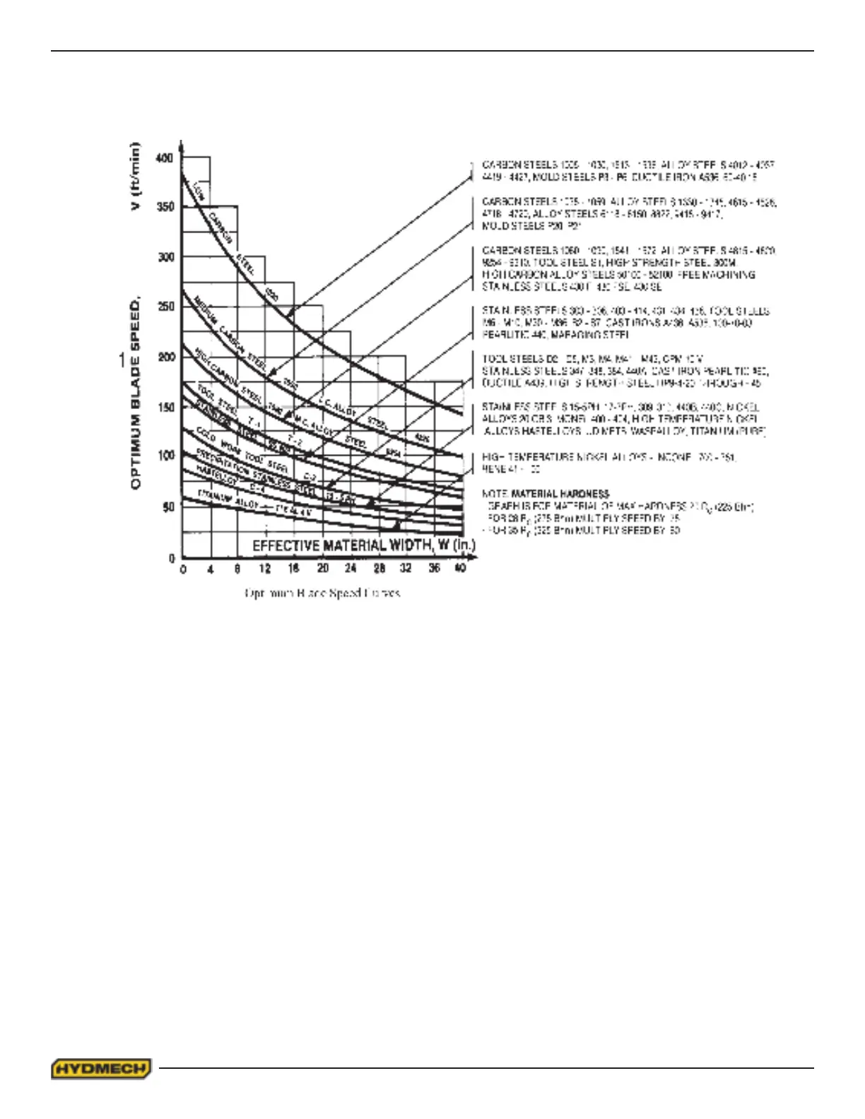 2. Material Hardness - The graph above illustrates blade speed curves for materials of hardness 20 RC (225 Bhn) or