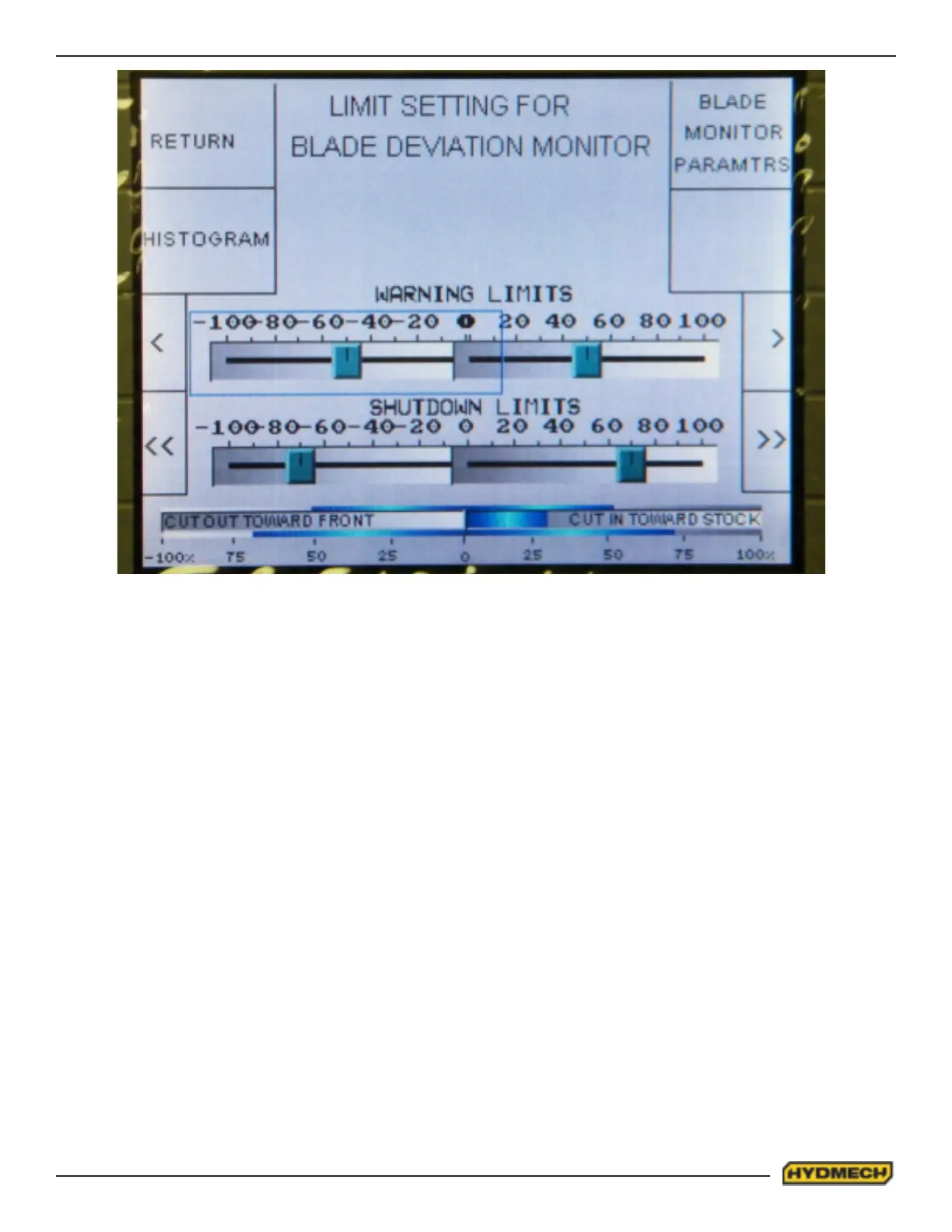 Cut in warning limit – (in - cutting towards infeed, range -100 ~ 0) This parameter will adjust the warning limit if the blade