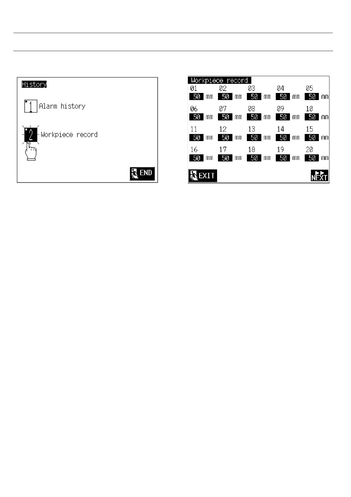 Select 2. < Workpiece record > Feeding length history.