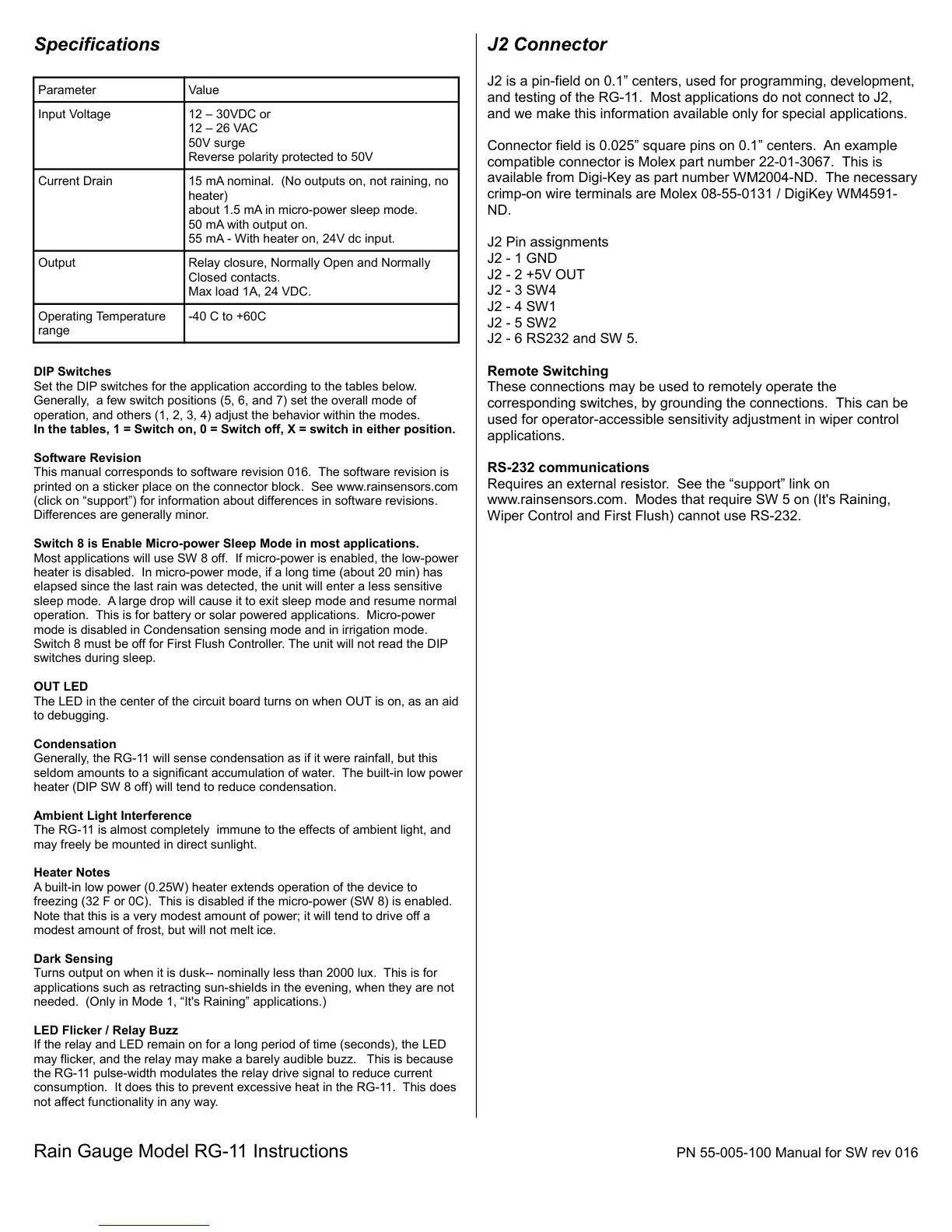 Rain Gauge Model RG-11 Instructions PN 55-005-100 Manual for SW rev 016