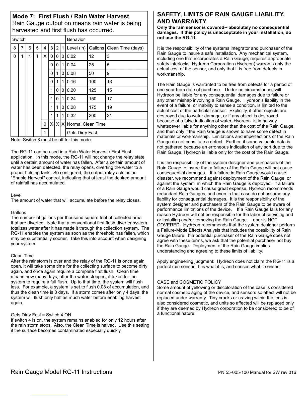Rain Gauge Model RG-11 Instructions PN 55-005-100 Manual for SW rev 016