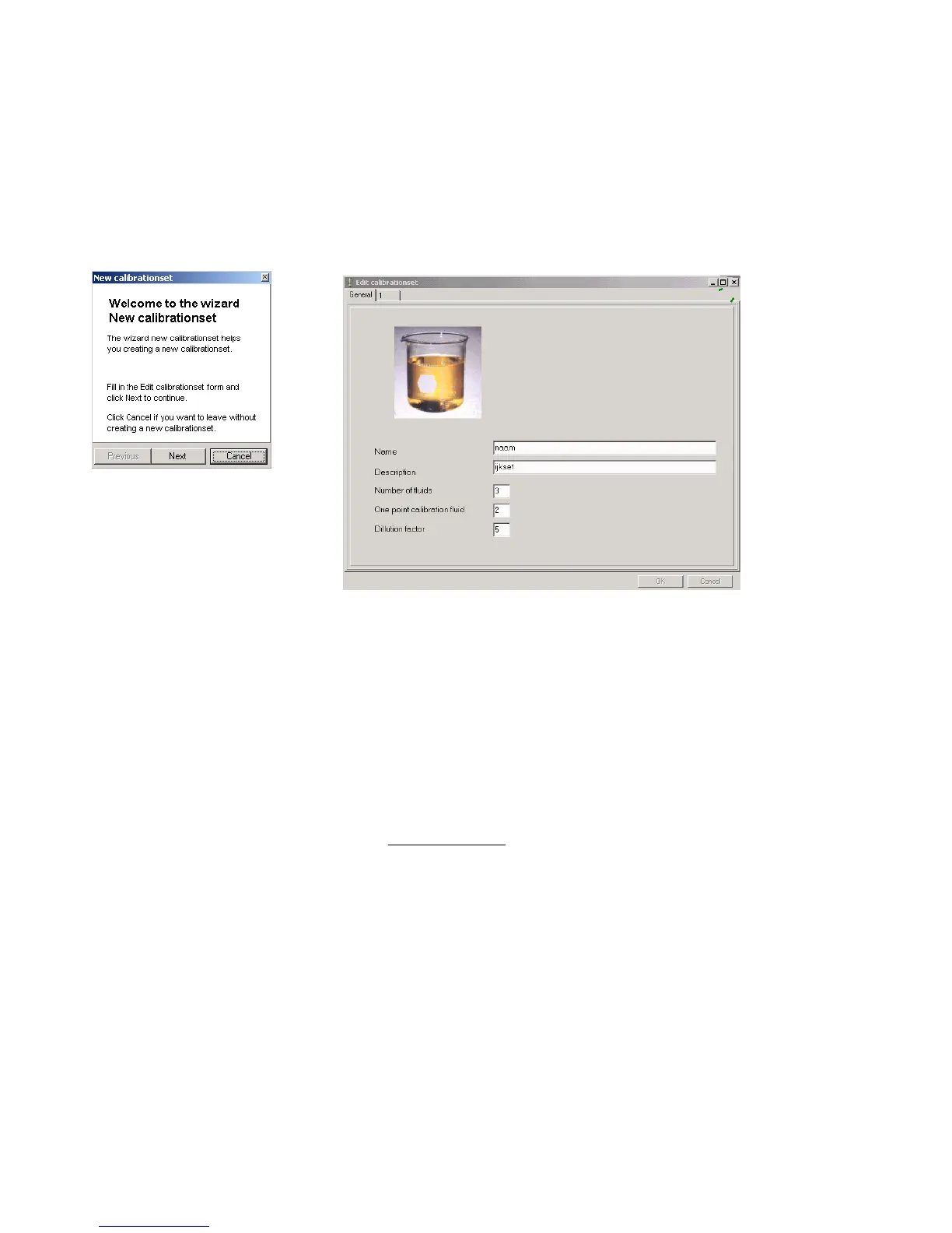 First, fill in the name of the calibration set, the number of calibration fluids, the dilution factor and which fluid has to be
